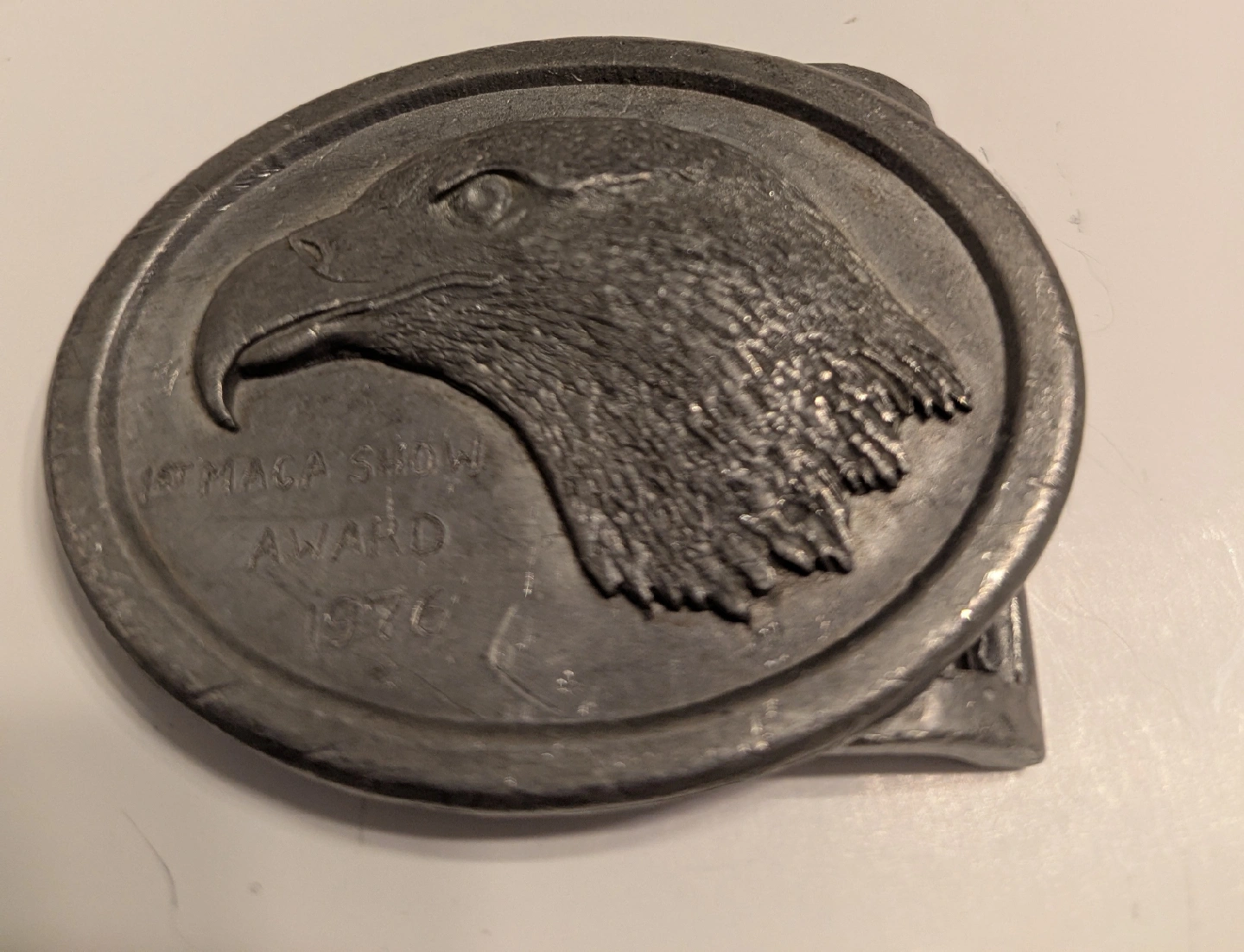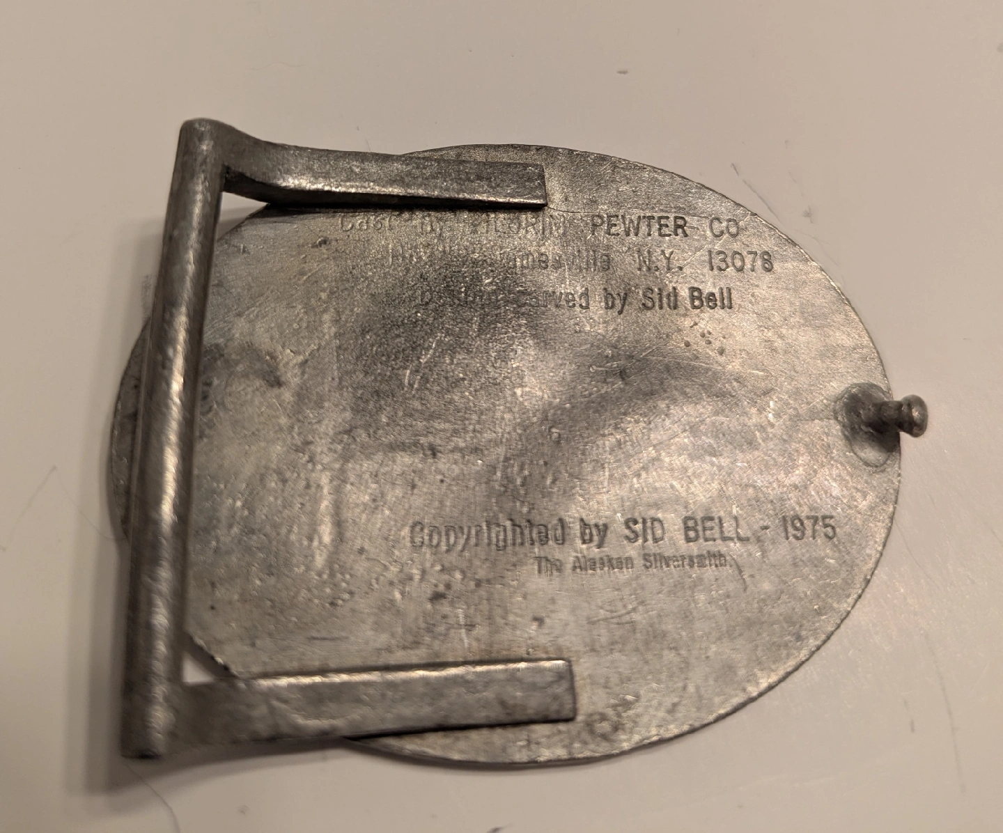 Selling a vintage belt buckle designed by Sid Bell and made by Alaskan Silversmiths! It features an eagle design and was copyrighted in 1975. It also has '1st IMACA SHOW AWARD 1976' on the eagle side.