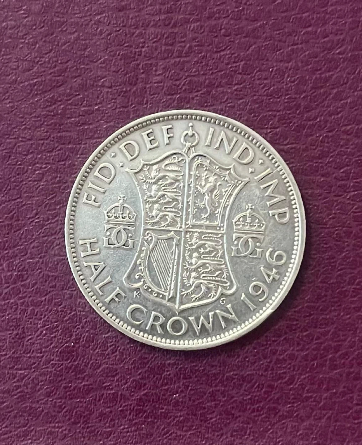 250Last six days available than I go back hometown Silver vintage Half Crown coin from 1946. It features a detailed design and is in great condition for its age. The coin has inscriptions and imagery from the era. A nice piece for collectors!