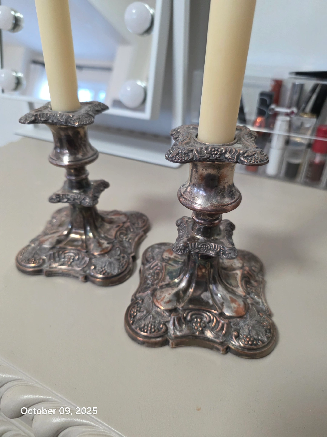 Selling a pair of vintage silver candlestick holders. They have a lovely, ornate design and would add a touch of elegance to any room. this add a great decoration to weddings!