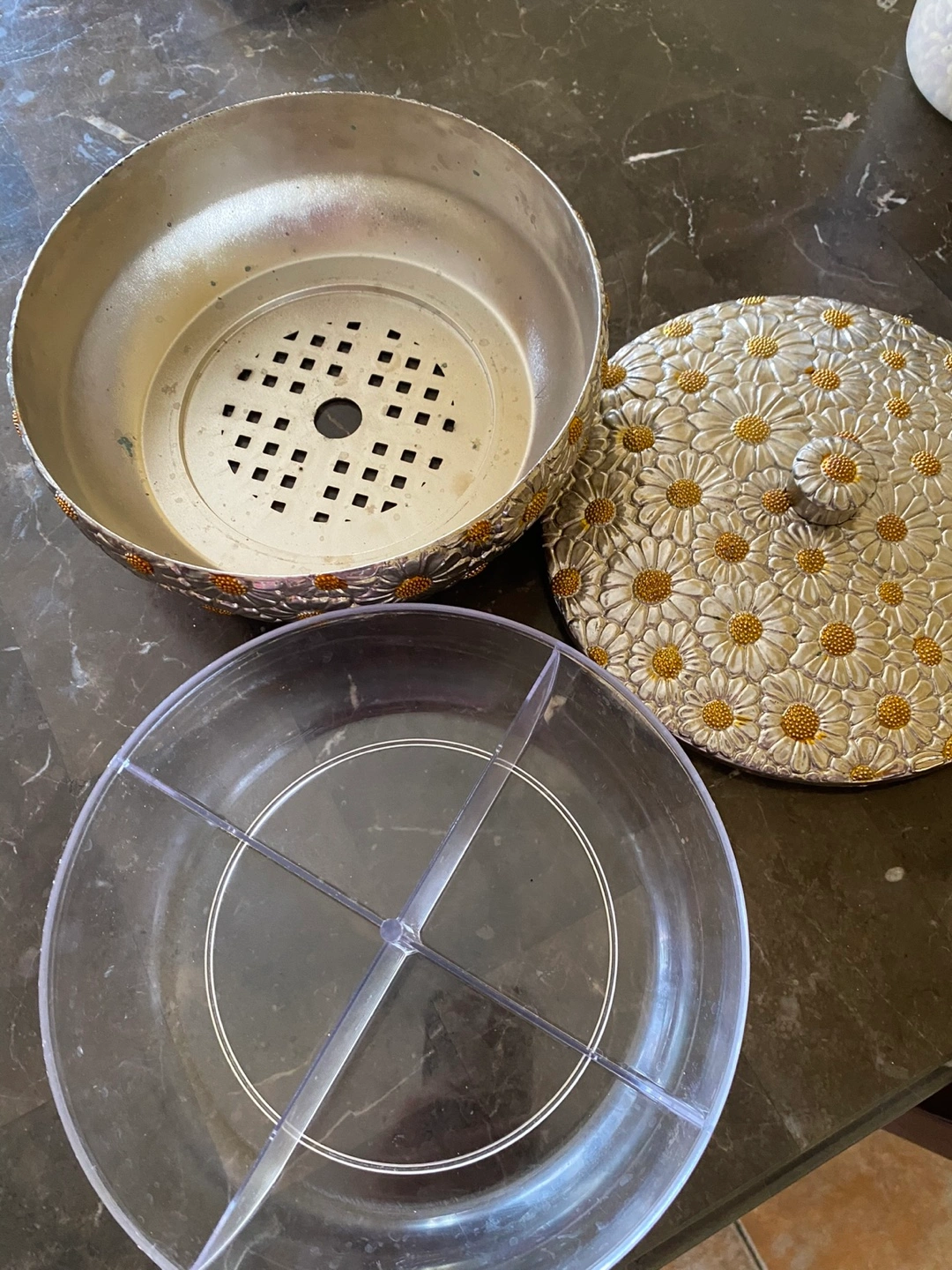 1000+Beautiful vintage trinket dish. Silver tone with embossed daisies. Features a removable, four-sectioned tray. Perfect for jewellery or small items.Decorative tray for snacks or candies