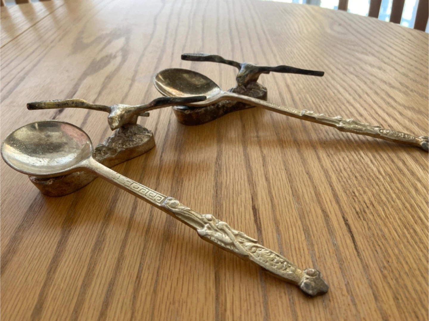 Selling a unique vintage silver eagle spoon rest and a matching spoon. The spoon has an ornate handle. Both pieces show signs of wear and age, adding to their vintage charm