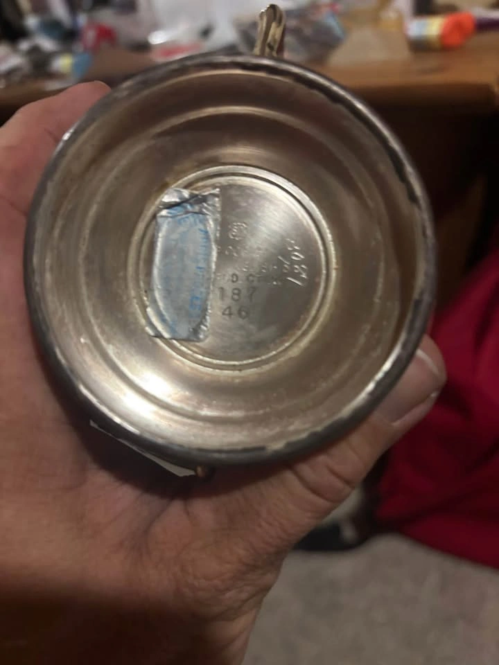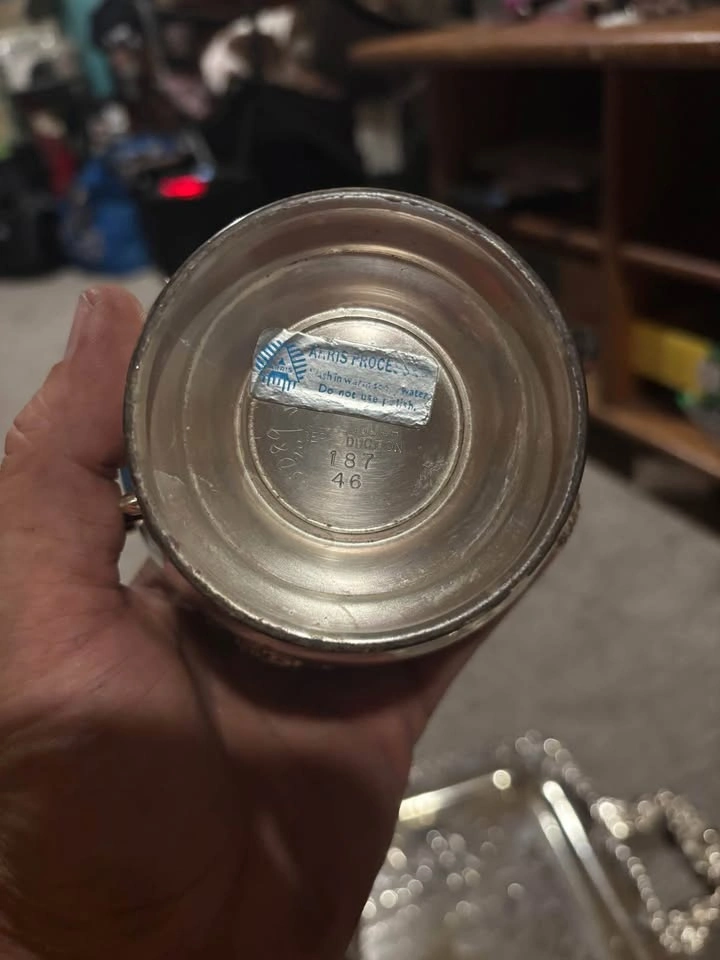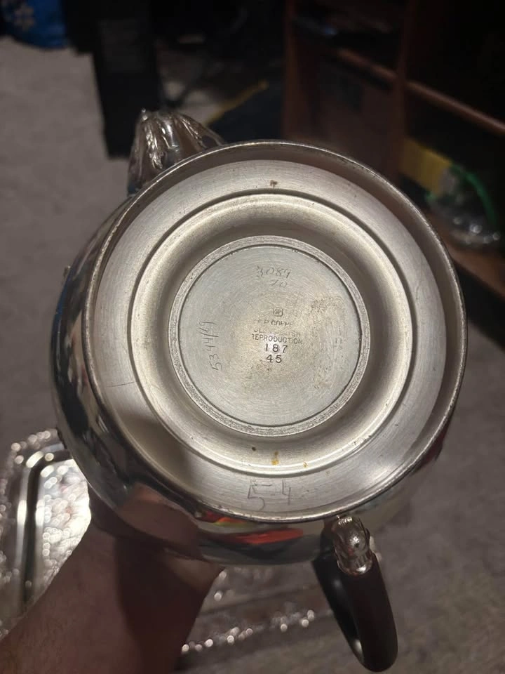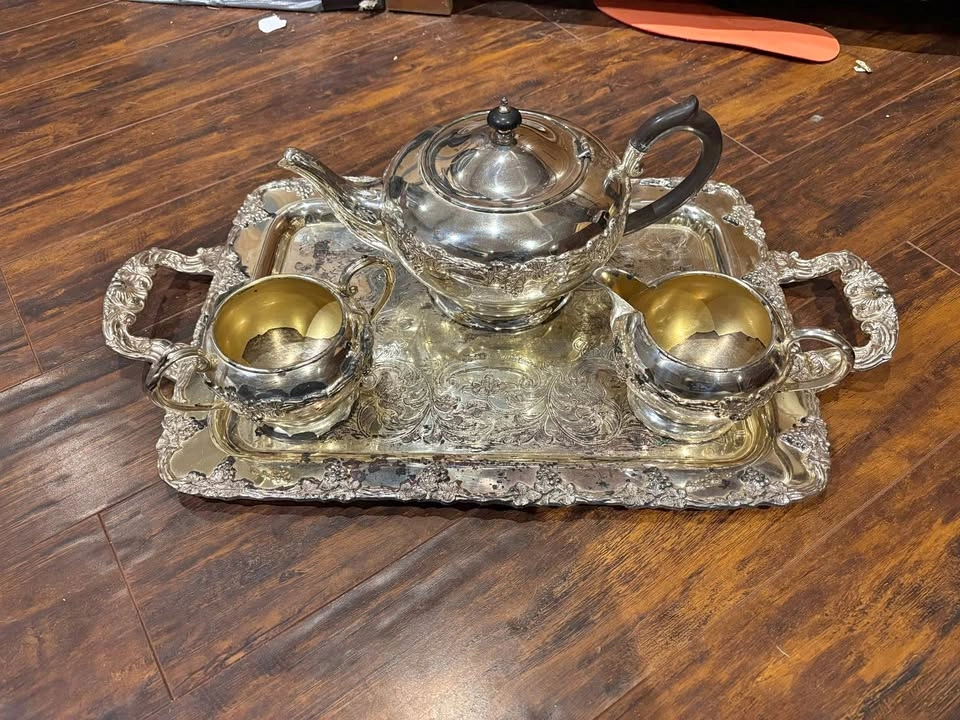 Vintage silver tea set. Has tea pot , creamer cup, sugar bowl and tray. Real silver(stamps shown in photos)