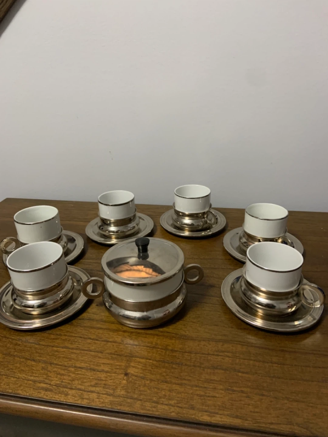 20Here's a lovely vintage espresso set! It includes 12 cups and saucers, plus a matching sugar bowl with a lid. The set features a classic silver and white design that would look great in any home. Perfect for parties or everyday use!