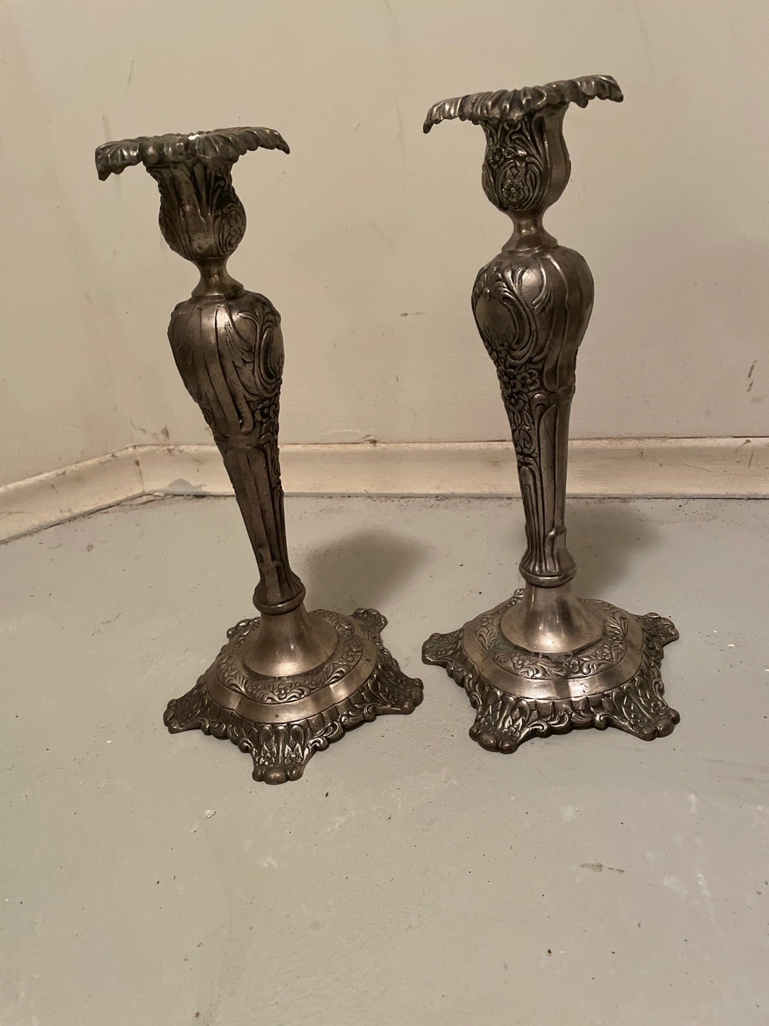 Matching set of candlesticks. Detailed design throughout. Would look lovely on a table or mantle. You can easily light up a room with some candles and these lovely pieces.