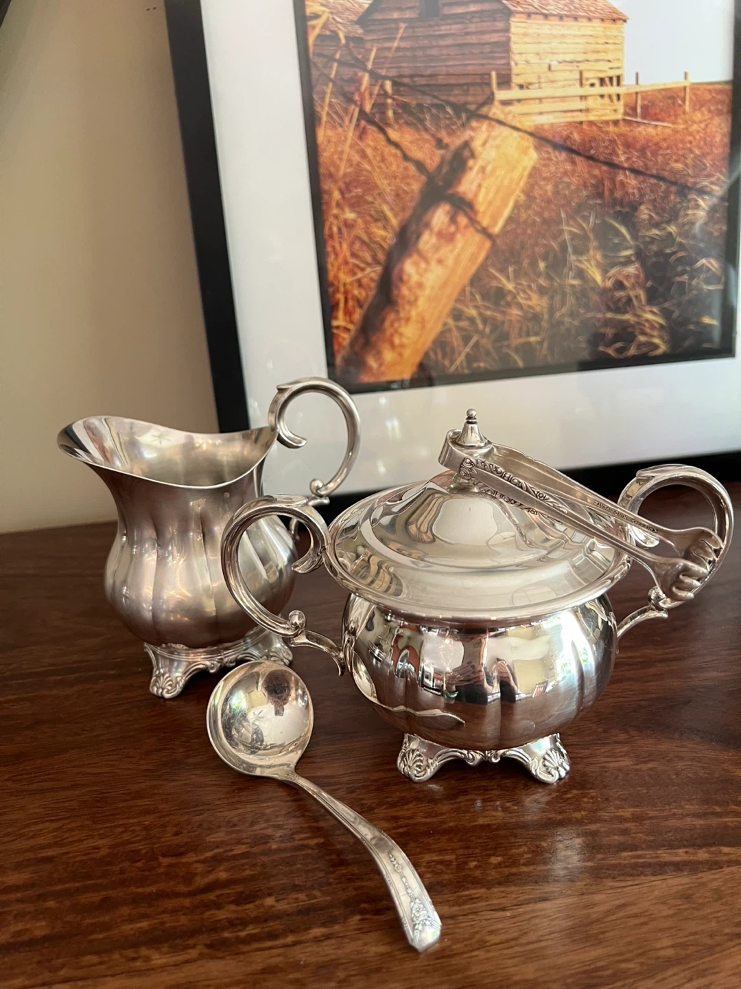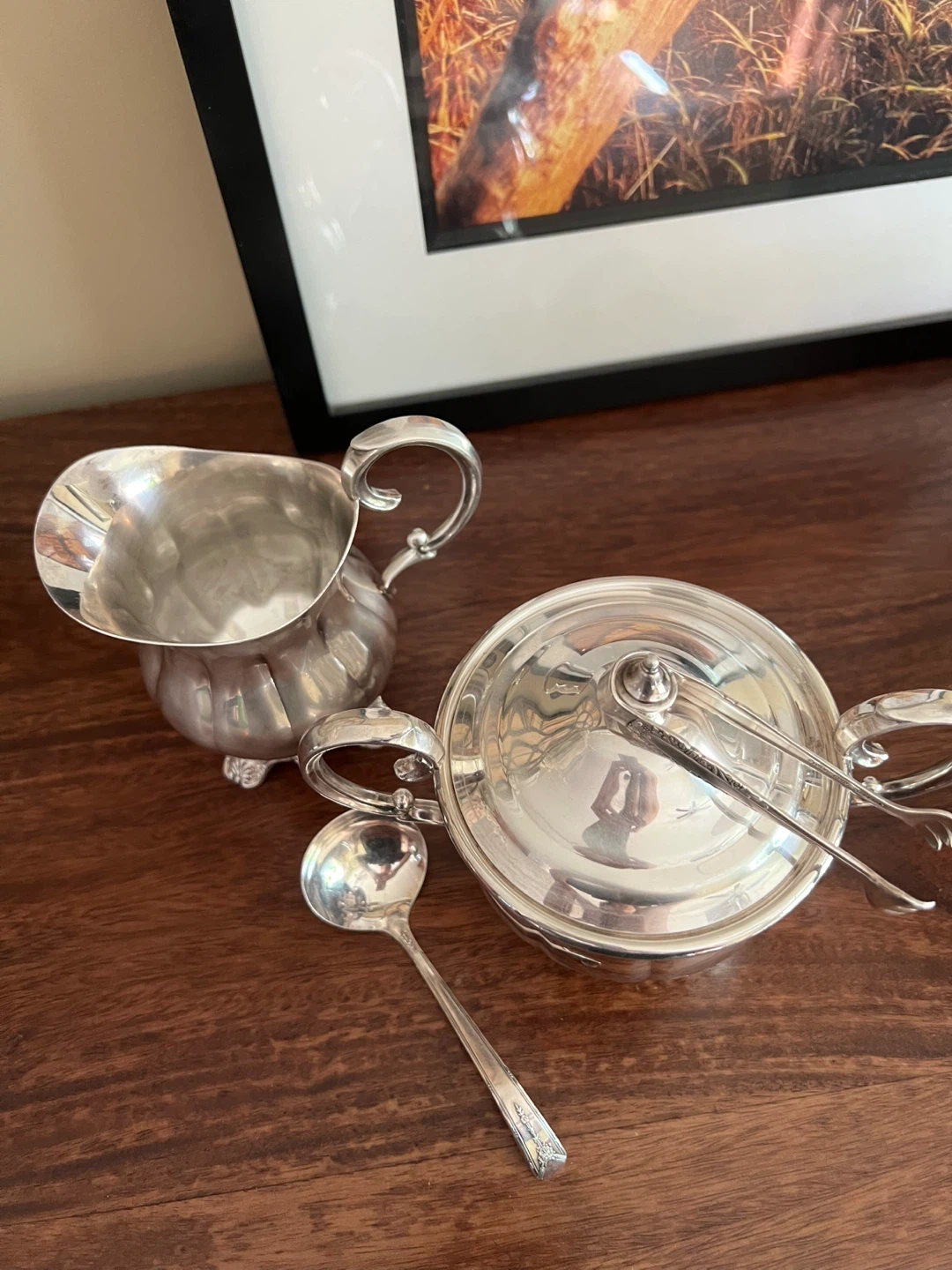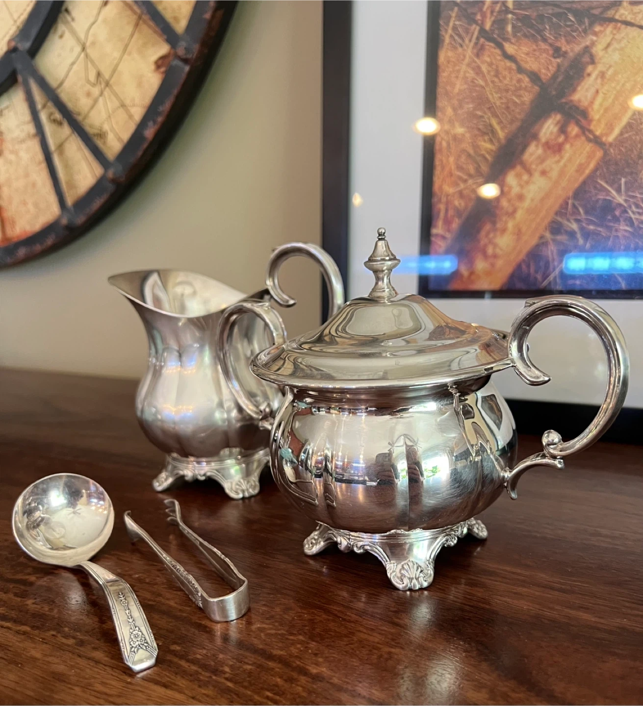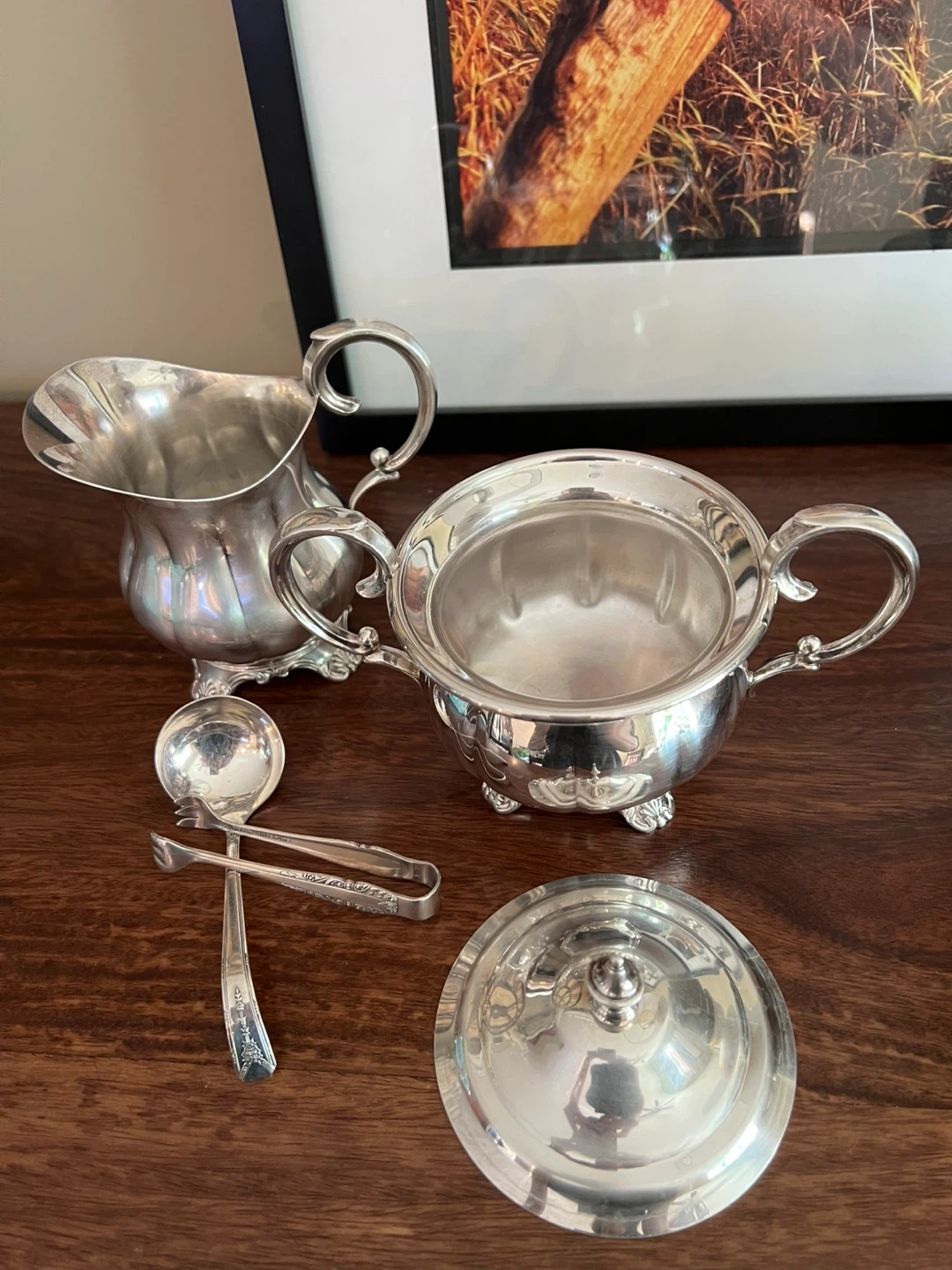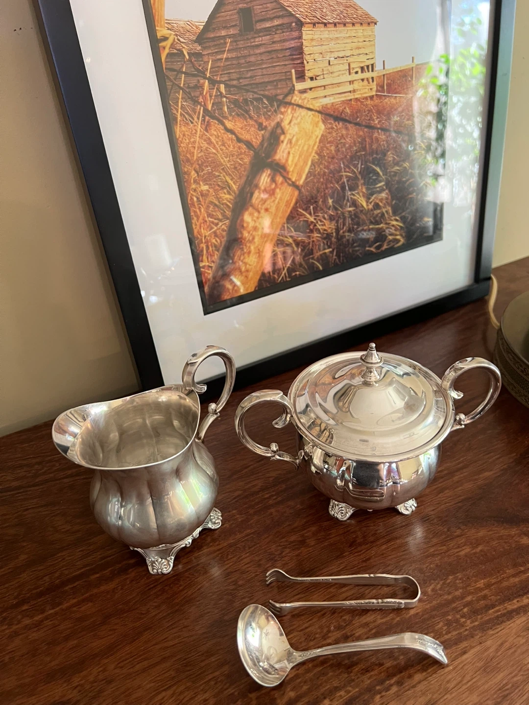 579Charming set looking for as new home!!! Creamer and lidded sugar bowl set You can select either sugar cube tongs or a sugar spoon Silverplated Stamped Beautiful clean condition Own a piece of history and add a touch of elegance to your tea or coffee service!!! Asking $25/Sold a set Interested? Message me and please check my other listings…