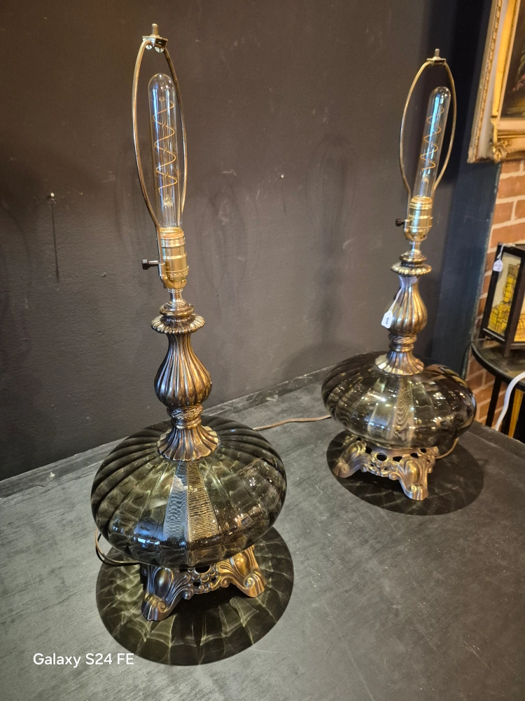 Vintage Smoked Glass Table Lamps – Hollywood Regency Pair Price: $400 (OBO) Condition: Excellent – Fully Working Location: [Add Your City or ZIP] Pickup / Shipping Available --- Description: Elevate your space with this stunning pair of mid-century smoked glass table lamps, dating from the late 1950s to early 1960s. These statement pieces feature pumpkin-shaped smoked glass bases paired with ornate bronze-finished metal footings—a perfect marriage of Hollywood Regency elegance and Art Deco flair. Each lamp has been tested and is fully functional, complete with original harps and beautiful Edison-style bulbs (included). Ideal for collectors, decorators, or anyone wanting a bold vintage accent. --- Details: Dimensions: Approx. 28" tall to top of harp Material: Smoked glass, cast metal (brass/spelter) Style: Mid-Century Modern / Hollywood Regency Includes: Both lamps + bulbs (shades not included) Condition: No cracks, chips, or repairs; even patina; original wiring (working) Visit Us in the Arbutus Walk Shopping District Finer Things by Late Nite Auctions 1926 West 4th Ave, Vancouver, BC (Corner of Cypress St. & West 4th) www.LateNiteAuctions.com