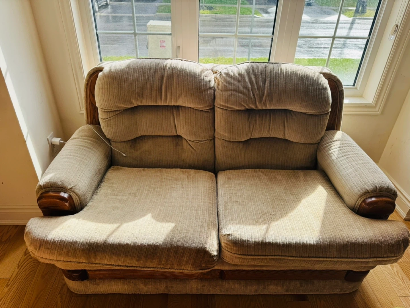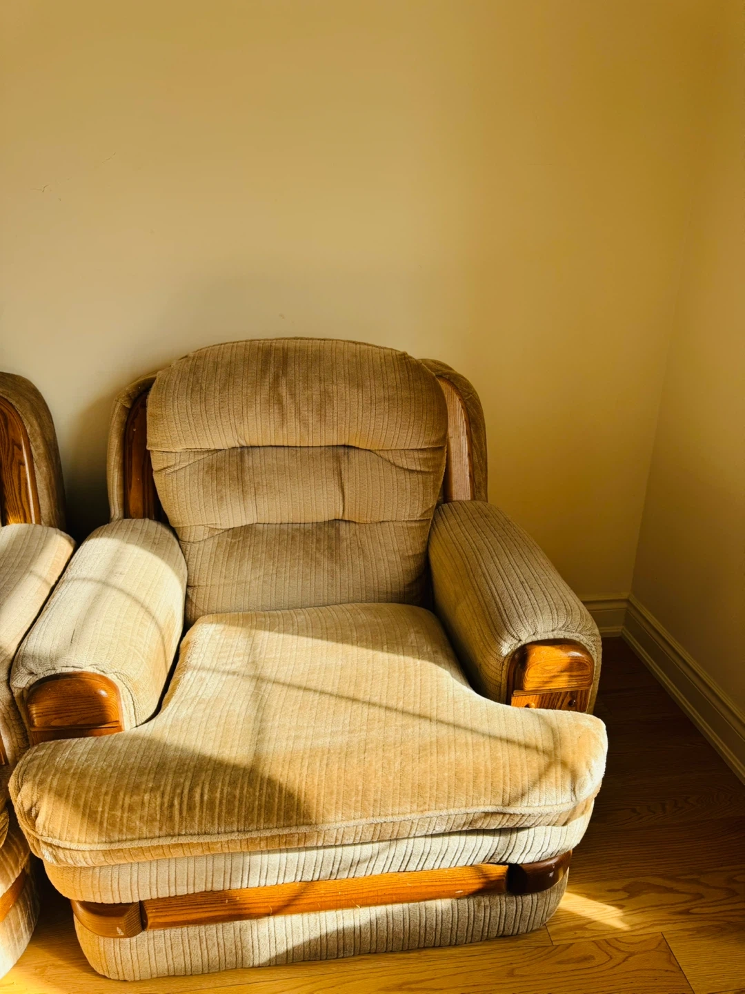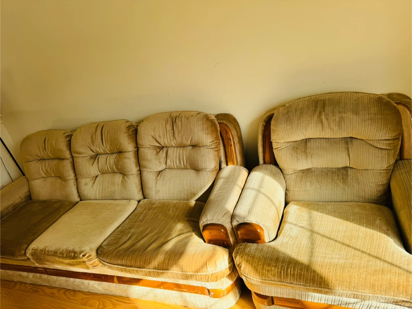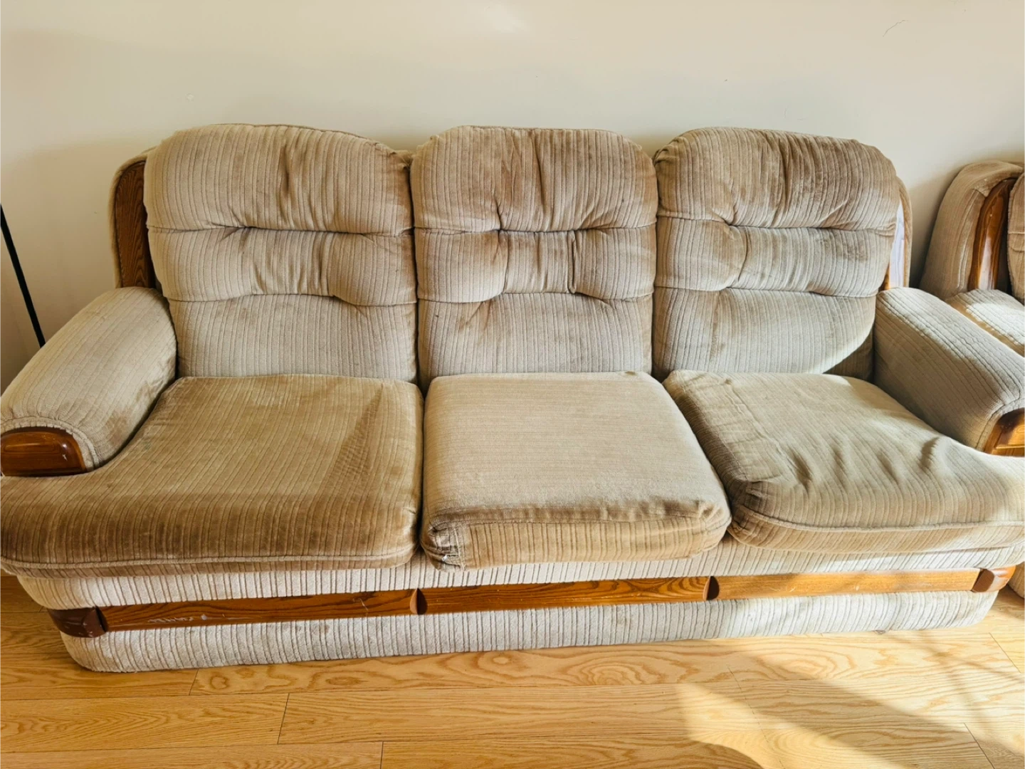 10Selling a vintage sofa set that includes a three-seater sofa, a two-seater sofa, and an armchair. The set is in a lovely beige colour with a corduroy-like texture. It would be perfect for a living room or den with a classic or retro style. A few signs of wear, but overall in good condition for its age!