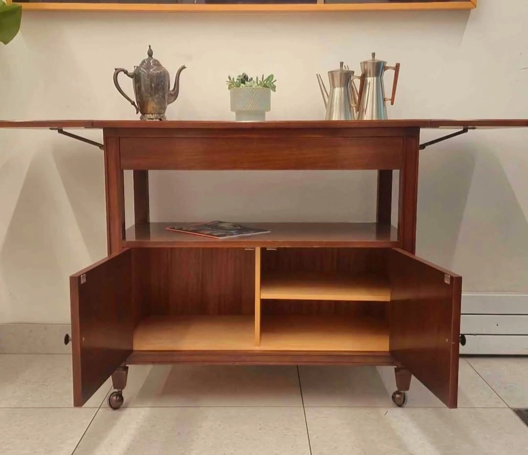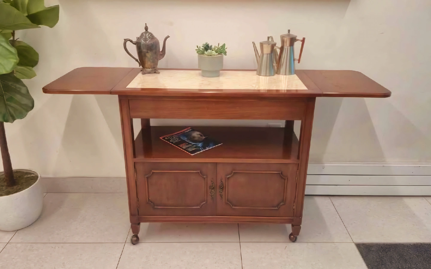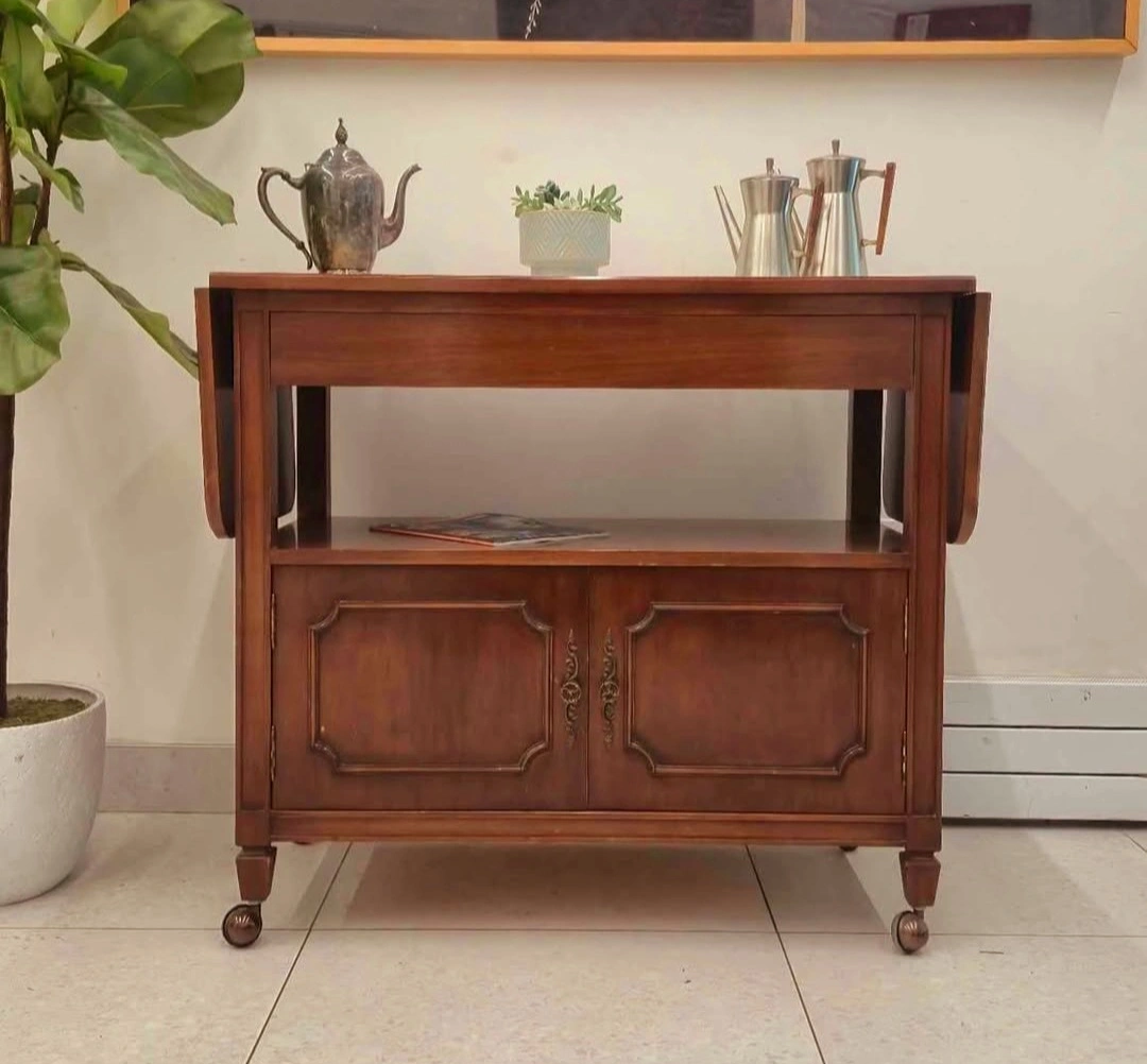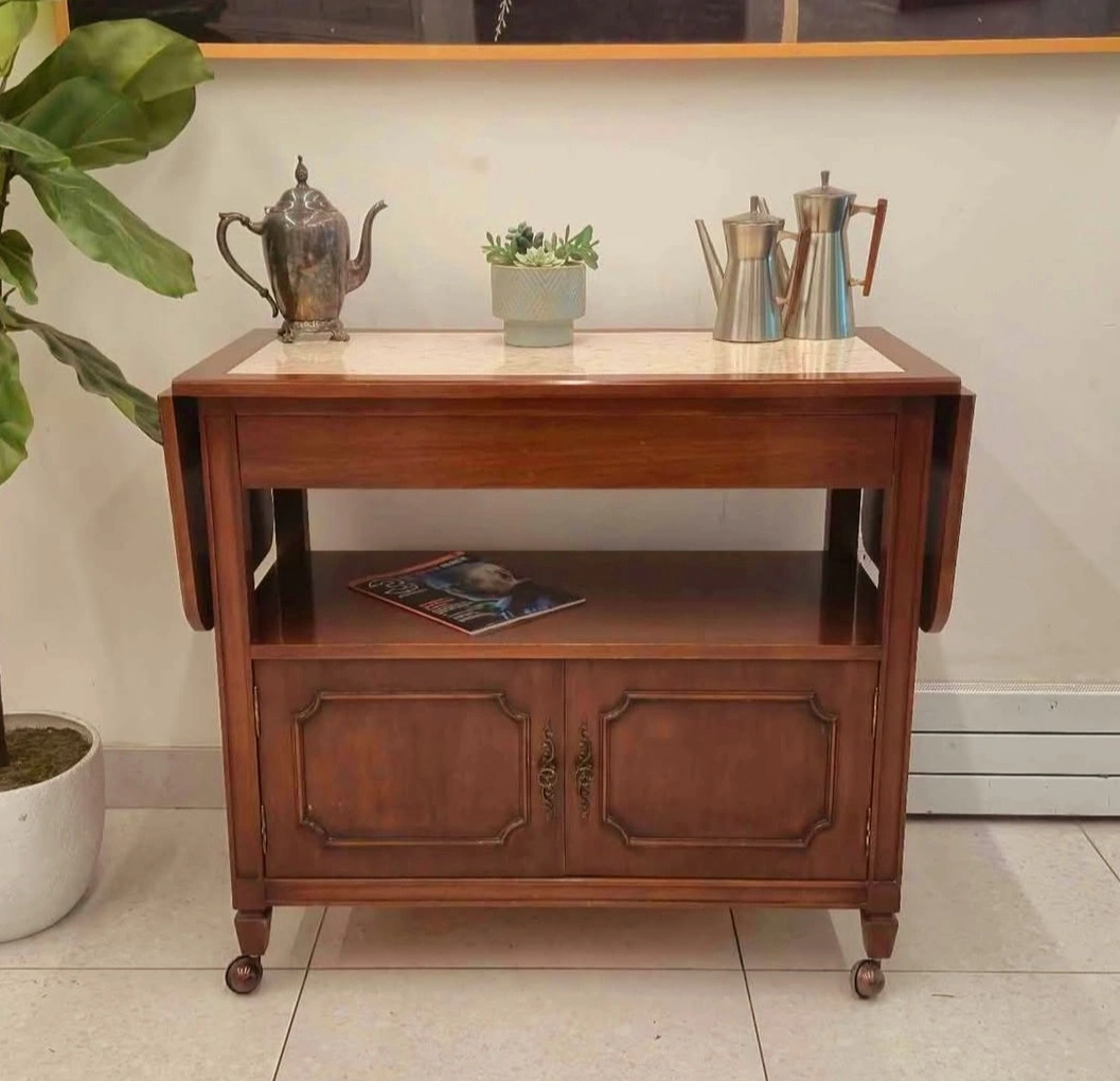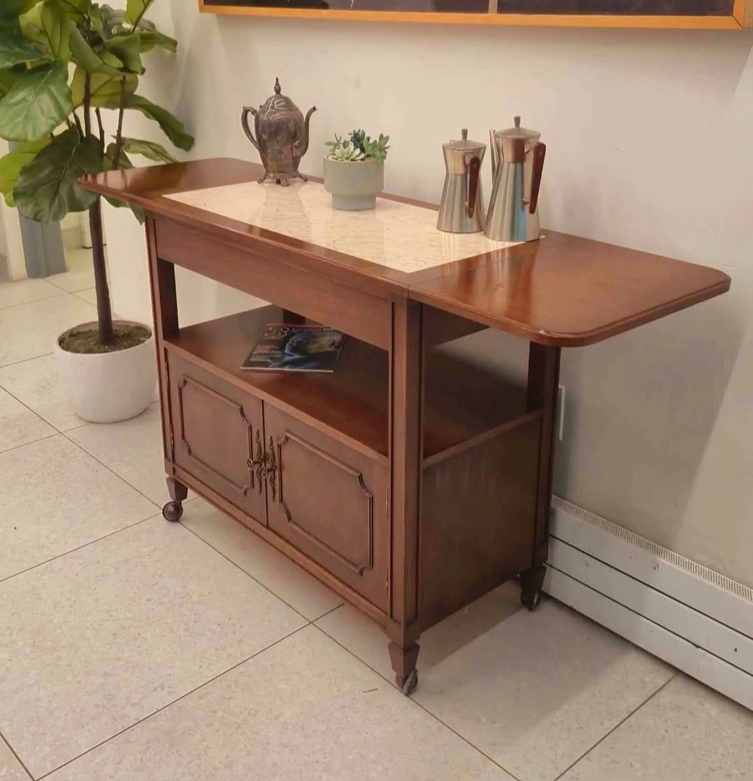 Vintage Solid Walnut Tea Bar Cart With Expandable Flaps. On Caster Wheels. Delivery Available Beautiful solid wood vintage serving cart with foldable drop-leaf sides. Features a marble-look inlay top, lower shelf with storage cabinet, and smooth-rolling caster wheels for easy movement. Perfect as a tea cart, bar cart, or accent piece for your living or dining room. 36-60.5w x 18d x 33h all in inches ✨ Details: Drop-leaf sides extend surface space Marble-look inlay top Original caster wheels for easy mobility Sturdy, solid wood construction Pick up in downtown Vancouver or delivery may be arranged for a reasonable fee. Priority is given to those who are able to pick up. Tags: Antique drop leaf dining table, vintage dining furniture, solid wood dining table, farmhouse table, traditional dining room furniture, extendable table, space-saving table, heirloom furniture, rustic dining table, classic wood furniture, collectible antique table, foldable dining table, vintage home décor, early 20th century table, handcrafted antique furniture. Westendtrends furniture vanvaluevintage film local canada set dec