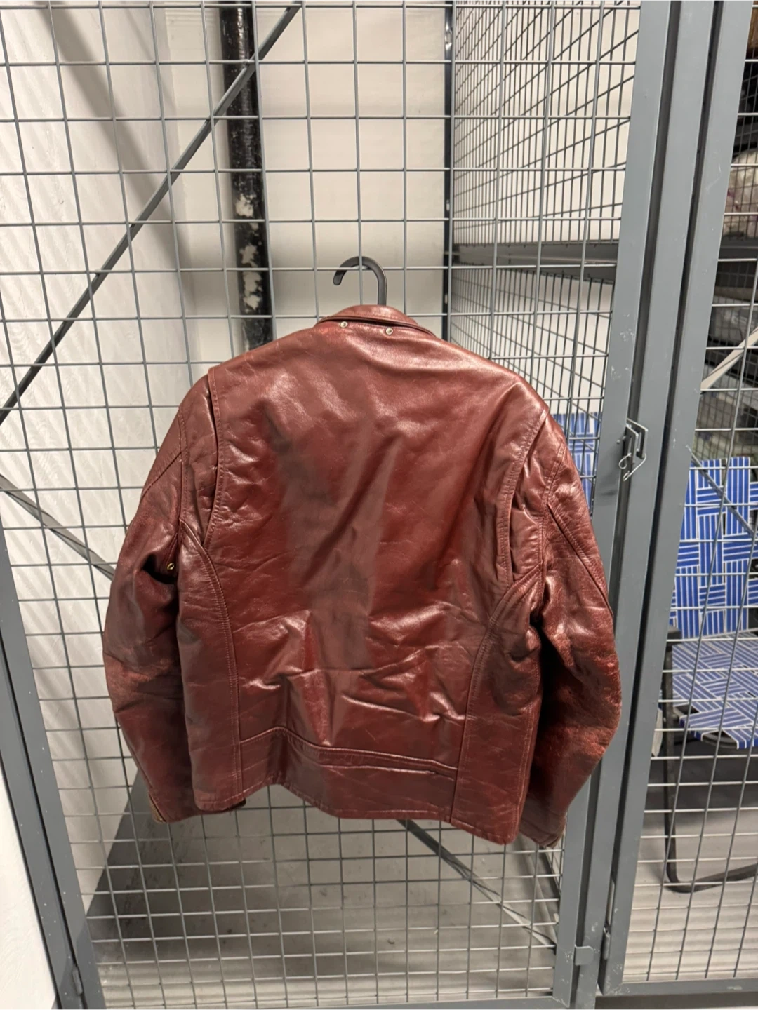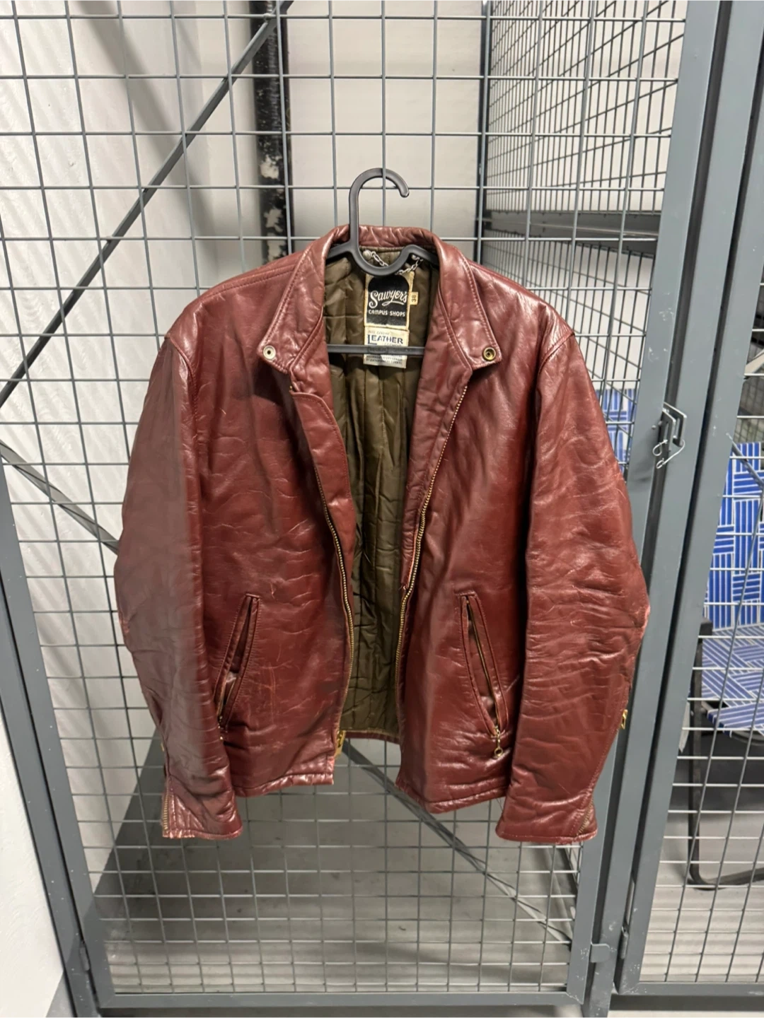 10Selling a vintage Souvenir brand genuine leather jacket! It's a stylish piece with a classic look. The jacket is made of leather and features a zippered front and pockets. Perfect for adding a touch of retro flair to your wardrobe!