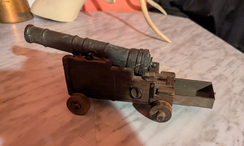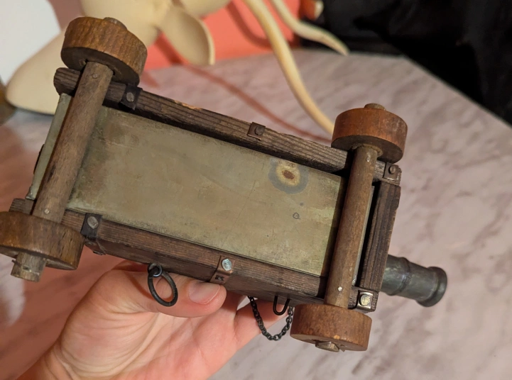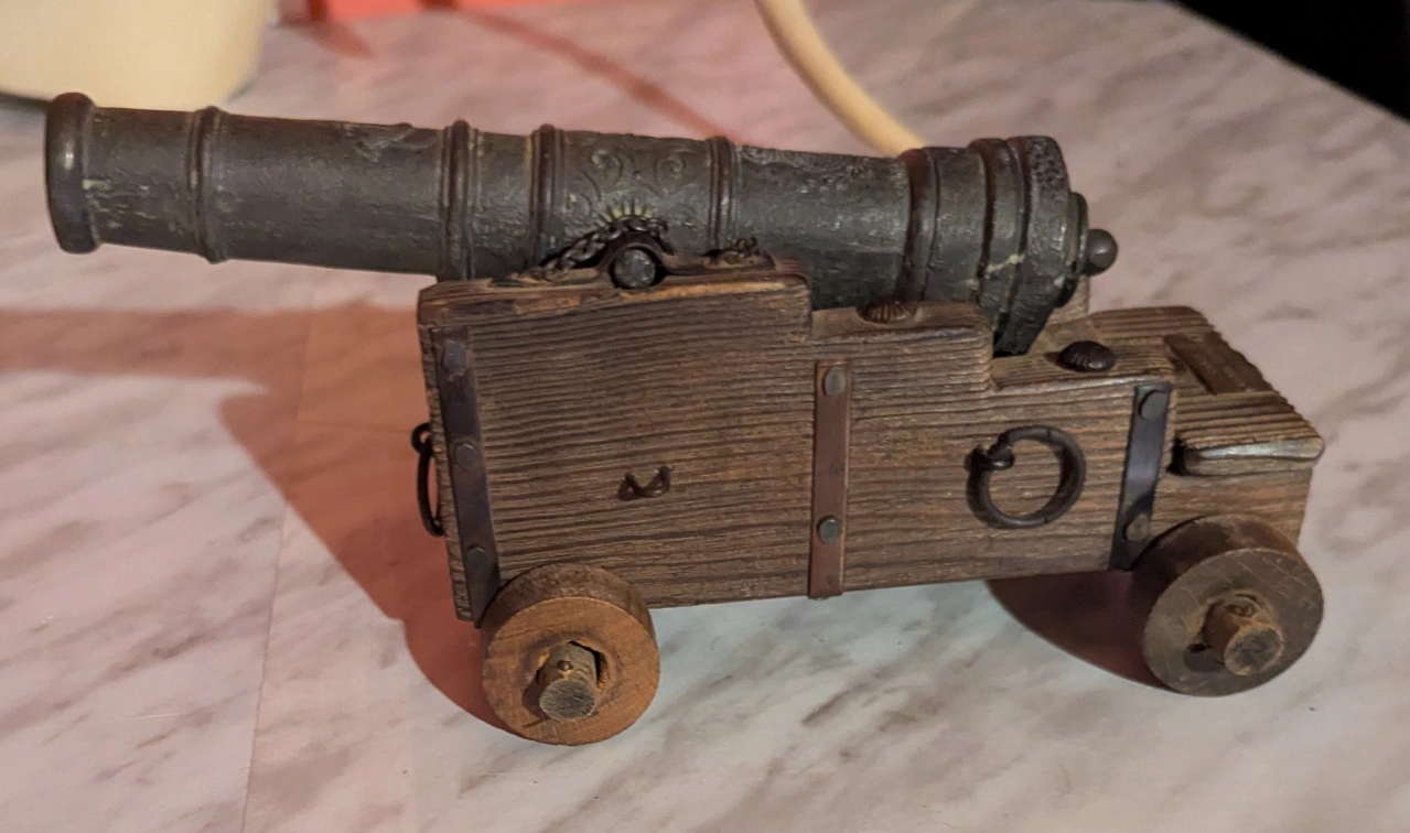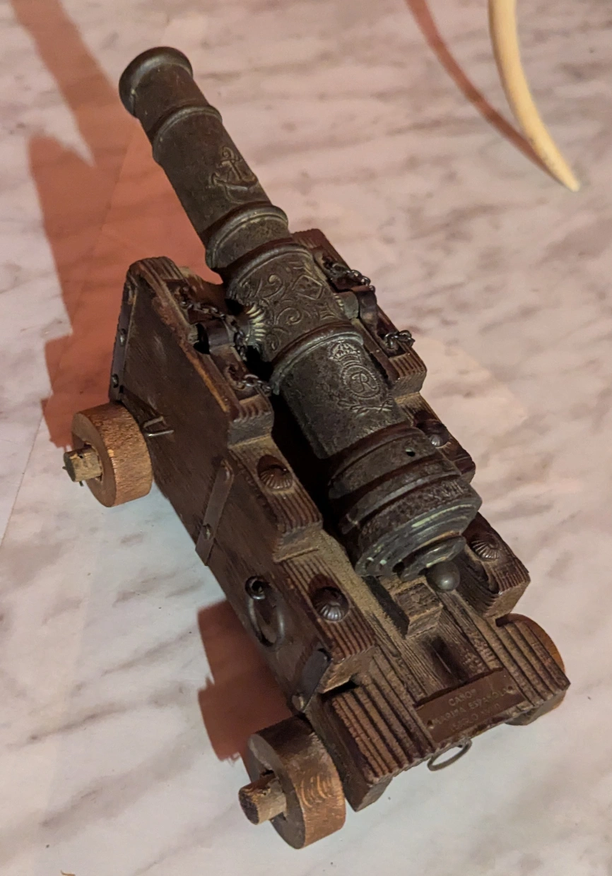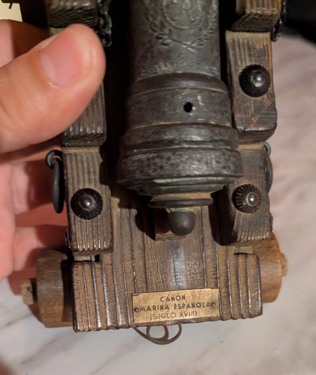 Selling a vintage model of a Spanish cannon. It's made of wood and metal with a rustic, antique look. The cannon has intricate details and a small plaque that reads 'CAÑON OMARINA ESPAÑOLA (SIGLO XVIII)'. It would make a great decorative piece for a collector or anyone interested in historical artifacts
