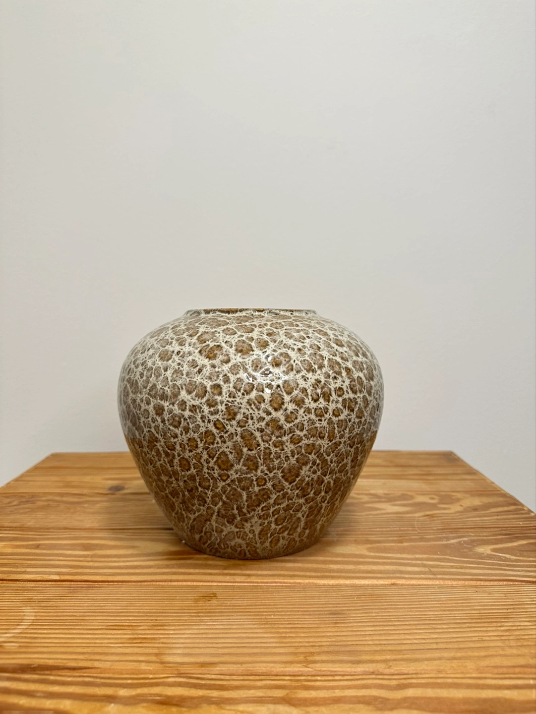 93Small round ceramic vase. Brown and beige mottled glaze. Unique design. Perfect for small bouquets or decorative use.
