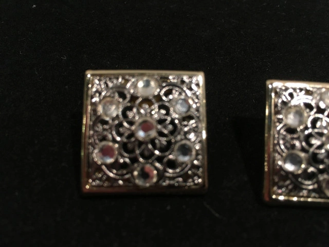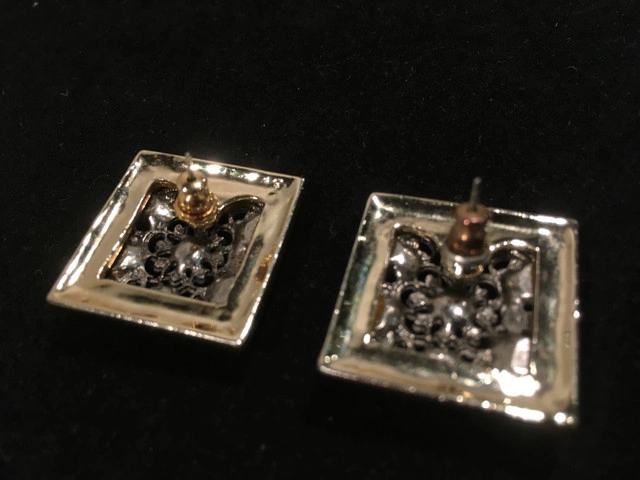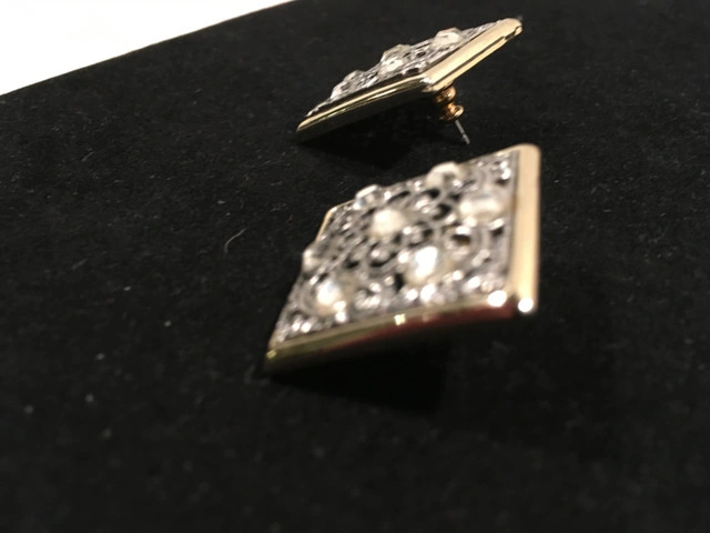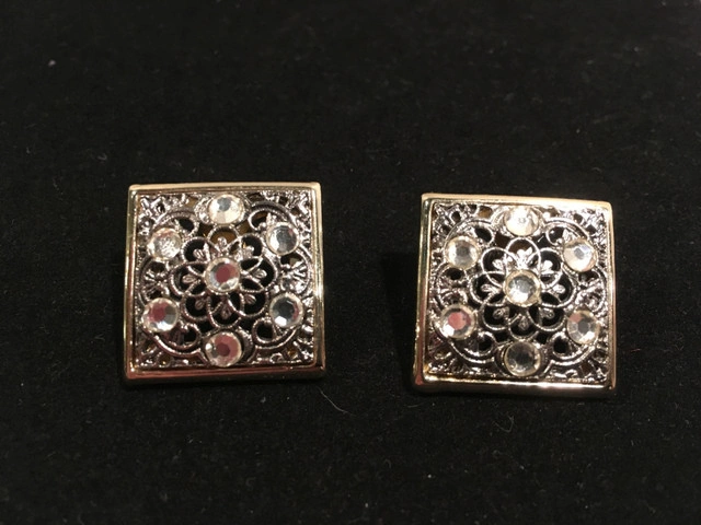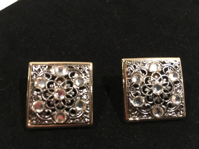 10Gorgeous vintage square pierced earrings. Filigreed silver metal with clear gemstones framed by a thin strip of (not real) gold. NEW. Approximately 2 1/4 centimeters squared. Great gift. Comes in a gift bag. Asking $10. Available for pick up in the Broadview/Danforth area. Contact-free porch pick up. Check out my other great stuff!