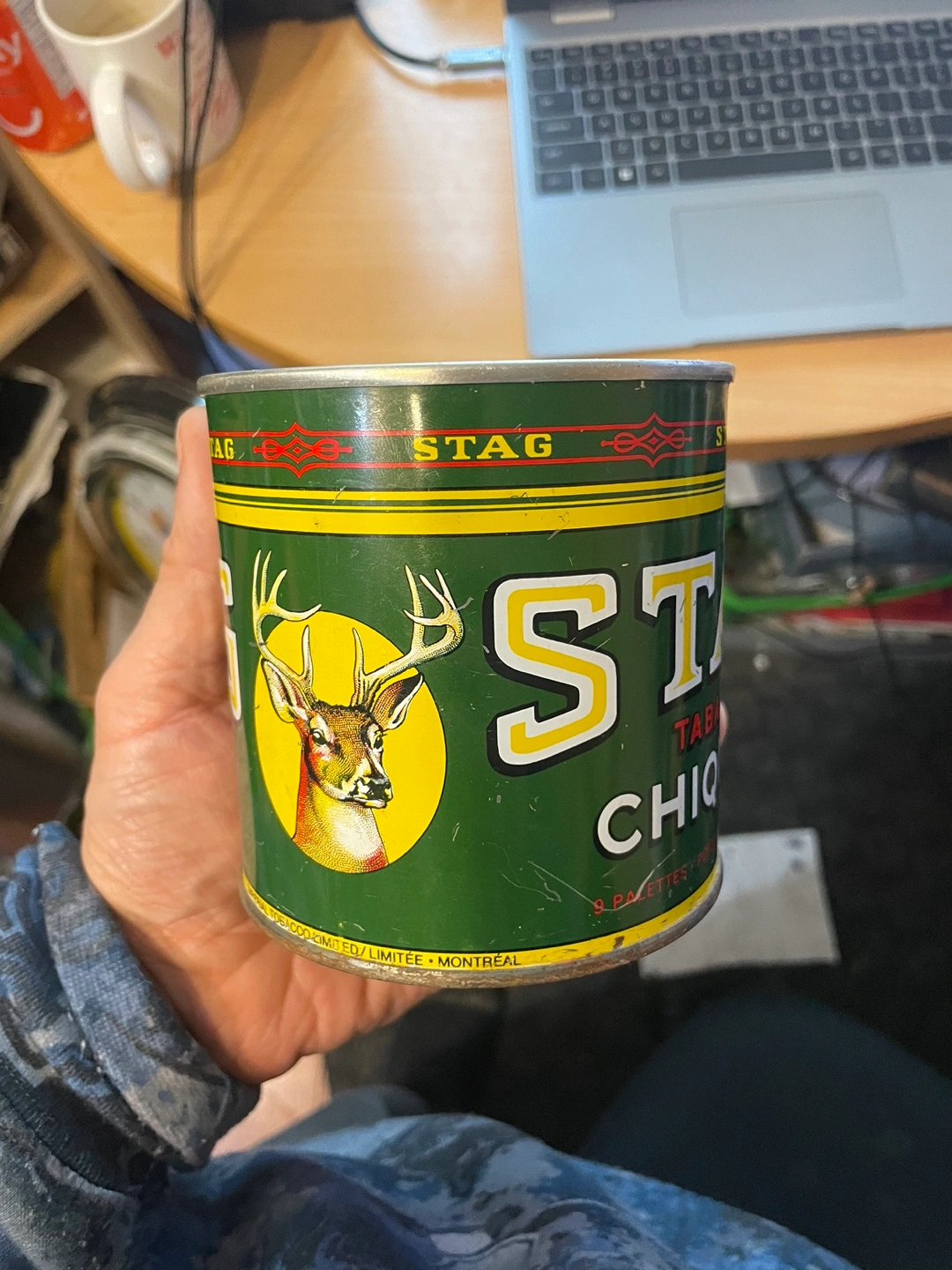 18Empty vintage tin. 1 lb. Green and gold tin with a deer illustration.