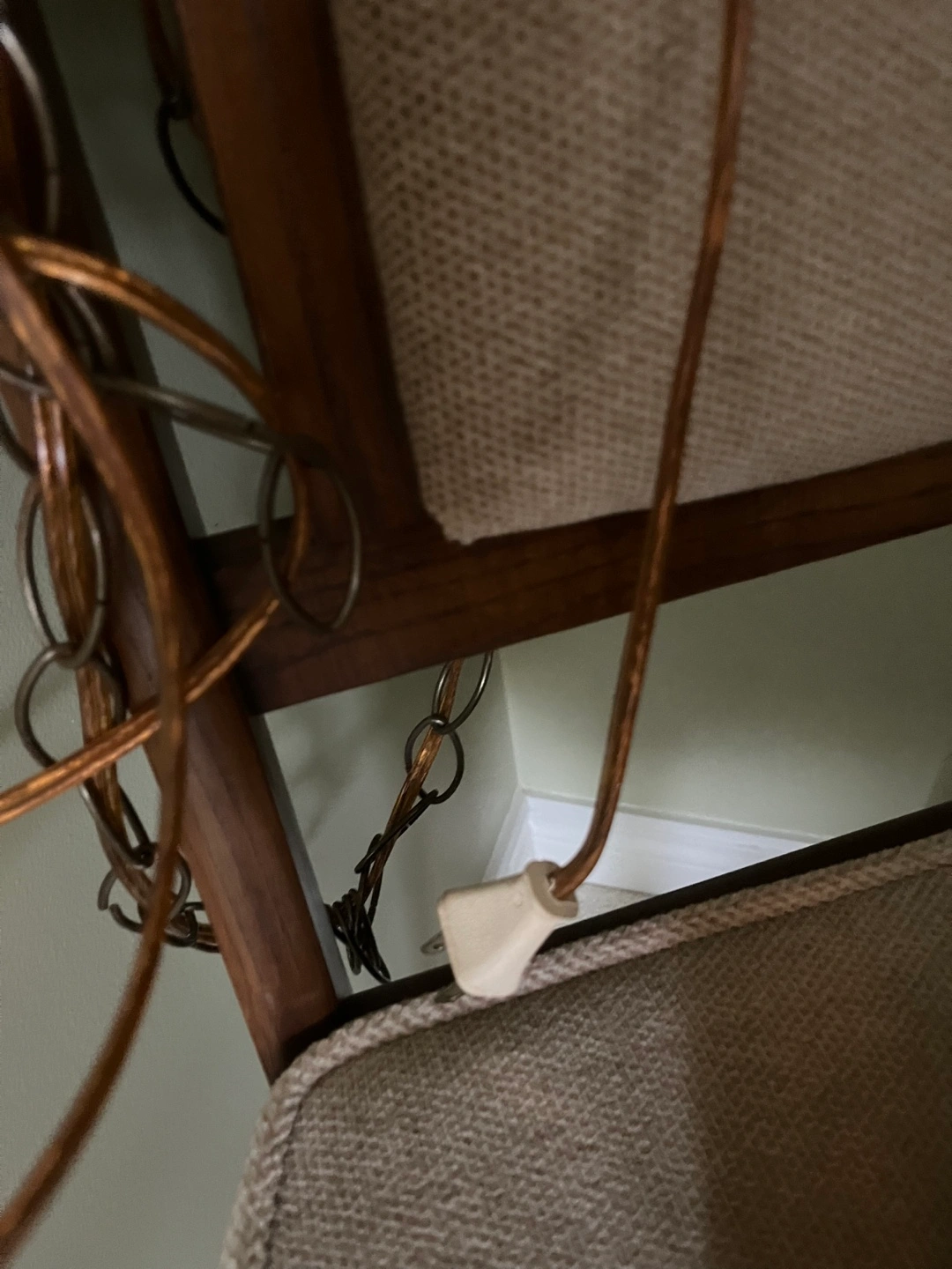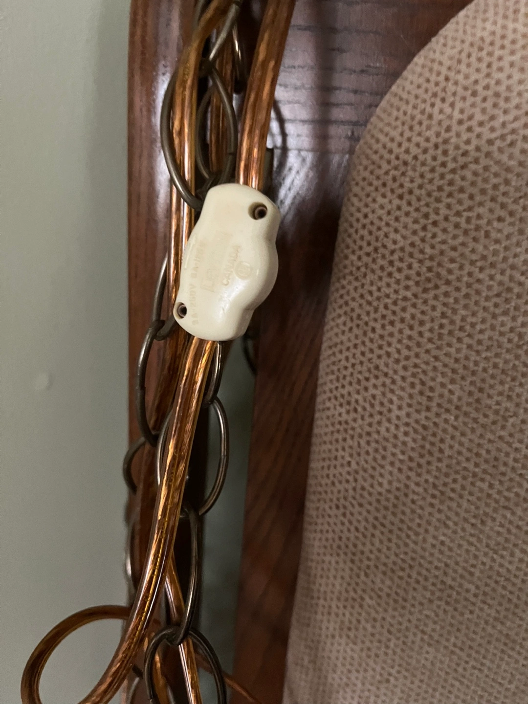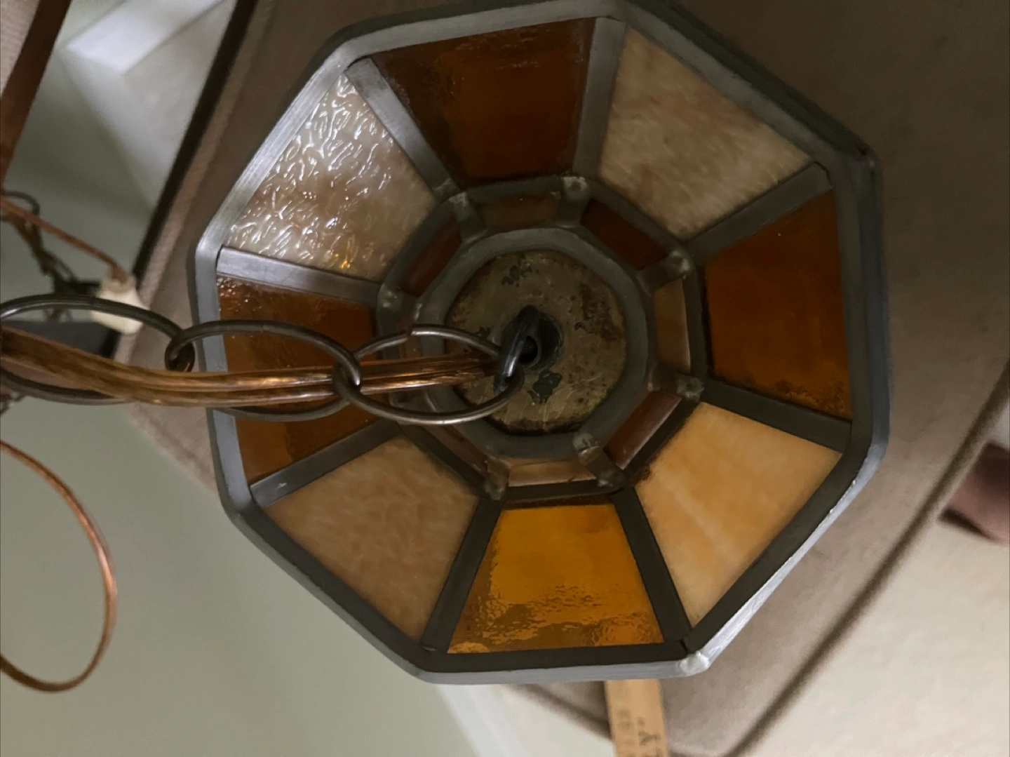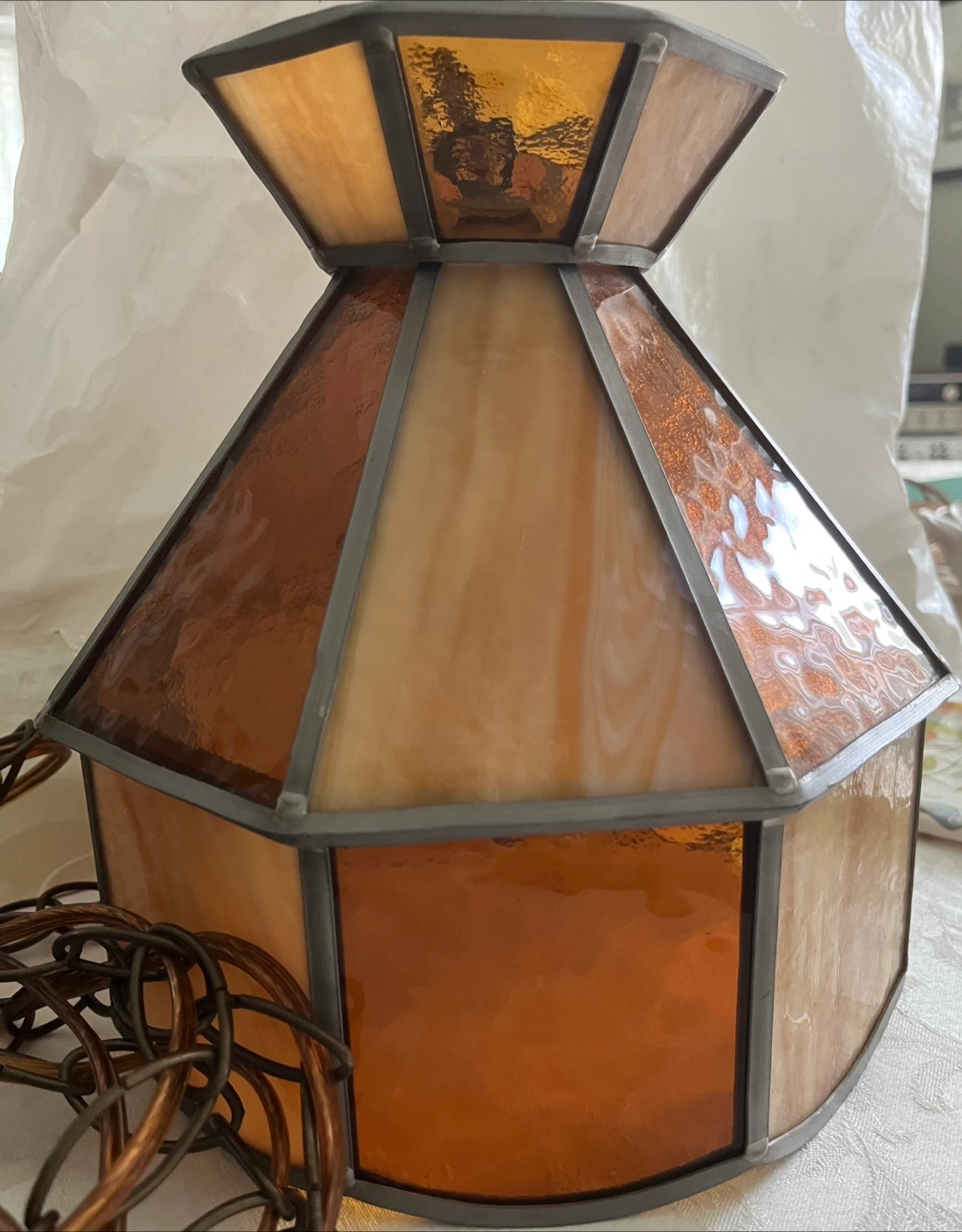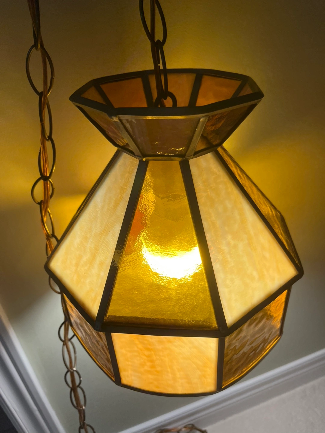 Here's a beautiful vintage stained glass hanging lamp! It features a warm, amber and cream colour palette. The lamp hangs from a sturdy chain, adding to its vintage charm