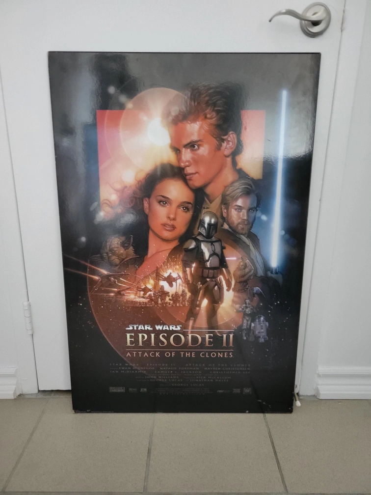 Vintage Star Wars Episode II Attack of the Clones on poster board. There is some wear and tear on the corners as seen in the pictures. It is very heavy, as it is on thick particle board. It has the original holes for mounting. Size 25"w x 36"h x 0.5"d Non-smoking household. No drop-offs.