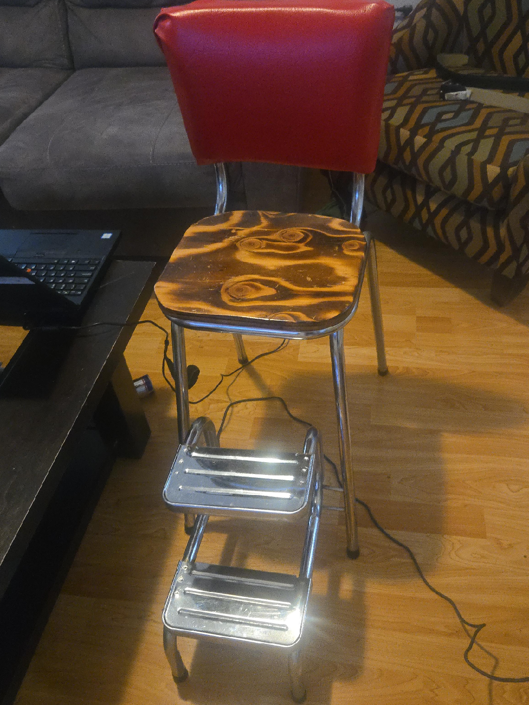 10Selling a vintage step stool chair! It features a red padded backrest, a wooden seat with a unique grain pattern, and chrome-finished steps and frame. Great for adding a retro touch to your home!
