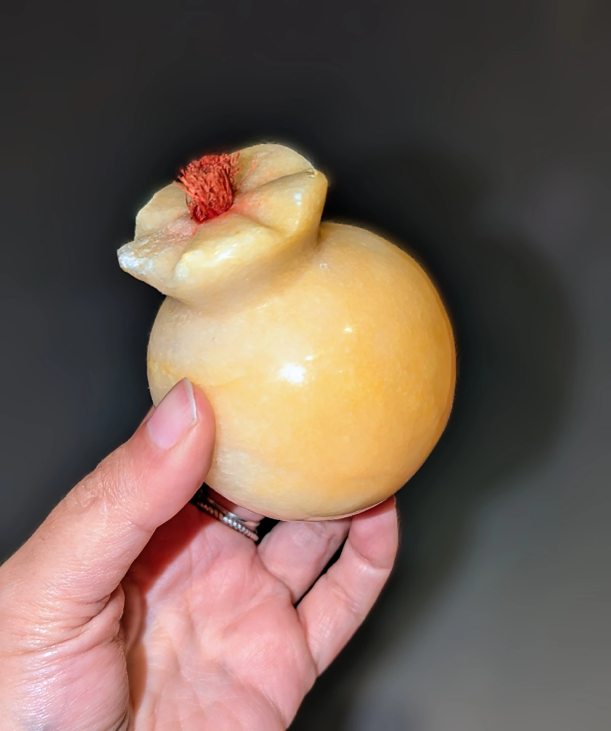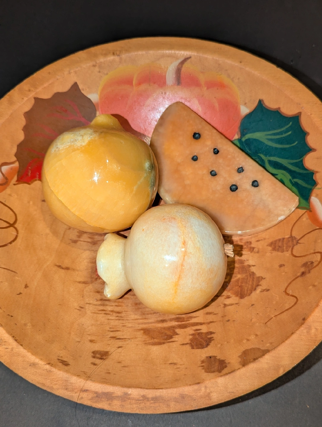 set of 3 vintage Stone carved fruits in wooden bowl onyx/alabaster ๐ Persimmon ๐ lemon ๐ watermelon each has some minor imperfections
