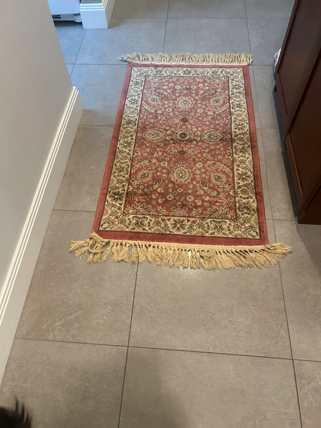 25Selling a lovely area rug with a vintage-inspired design. It features a beautiful pattern in shades of red and beige, complete with fringed edges. It would look great in any room. Size is 4’x 26”. 3” tassels