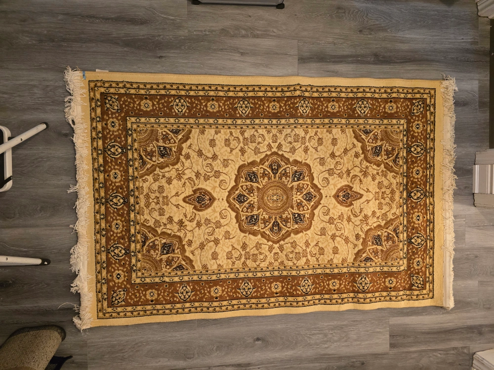 38Selling a beautiful area rug with a vintage-inspired design! It features a detailed pattern in beige and brown tones, perfect for adding a touch of warmth to any room. The rug has a fringed edge and is in great condition. It would be a great addition to your home decor