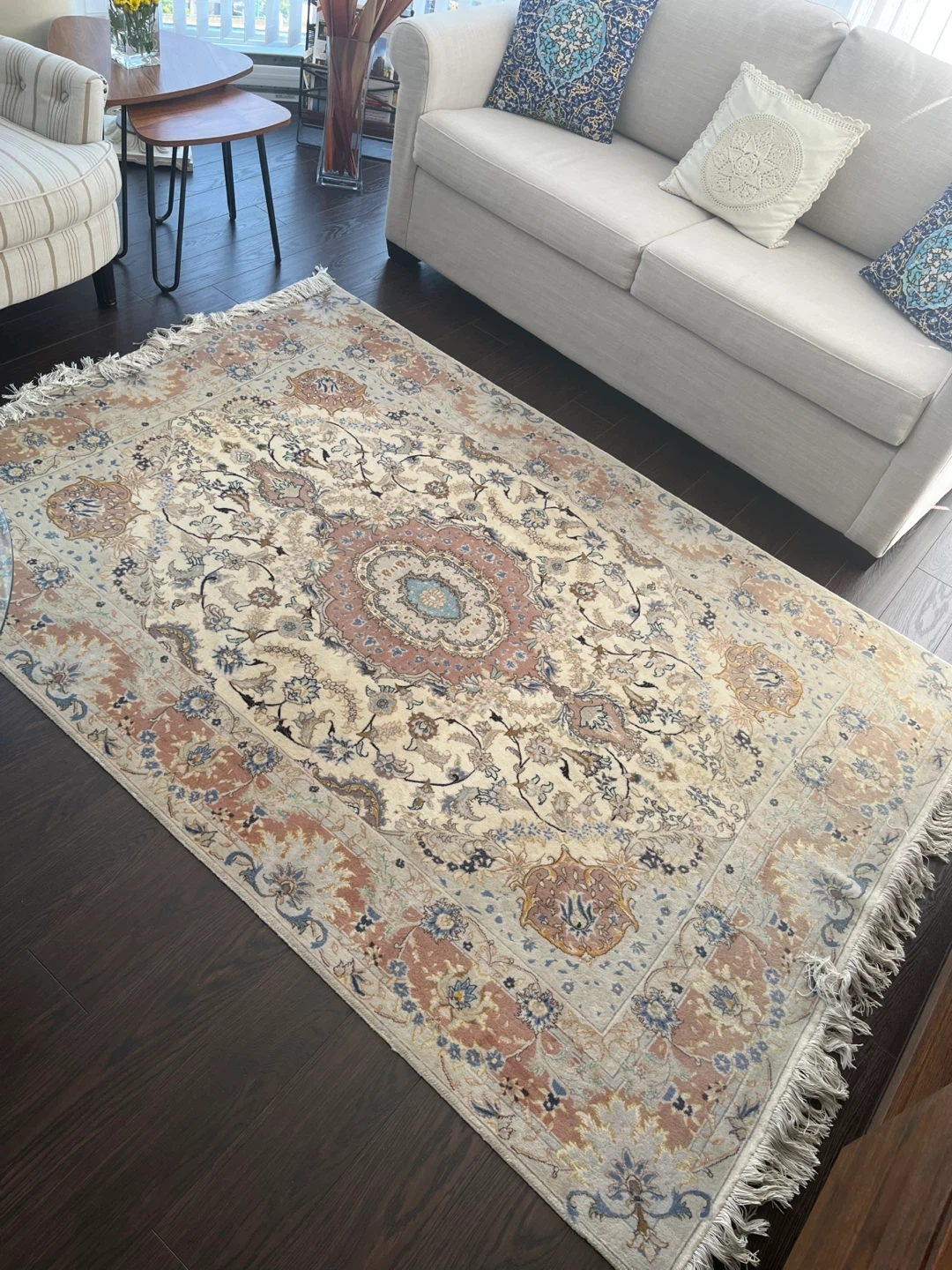 Selling a beautiful area rug with a vintage-inspired design! The rug features intricate floral patterns and a soft colour palette, perfect for adding a touch of elegance to any room. The material feels lovely underfoot, and it's in great condition. It would look great in a living room or bedroom!
