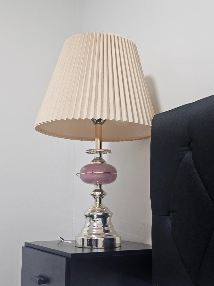 Selling a lovely vintage-style bedside lamp. It features a pleated lampshade and a decorative pink glass accent on a silver-coloured base. It would add a touch of elegance to any bedroom or living space