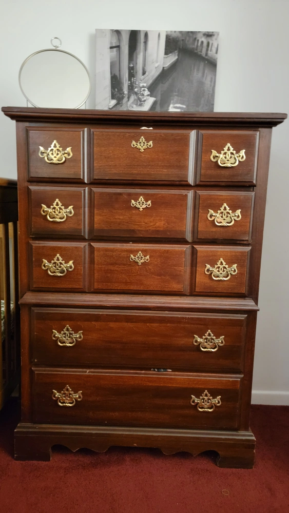 A lovely wooden chest of drawers with a classic design. It features five drawers with decorative gold-tone handles. Perfect for adding storage and style to any room! Pick up near 401 and Neilson, Scarborough.