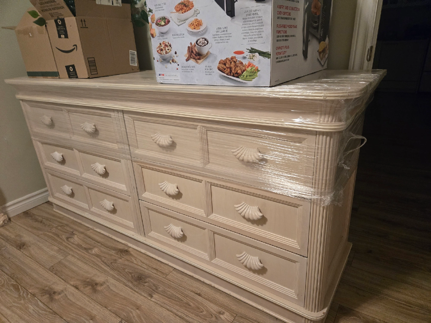 5Selling a vintage-style dresser with a charming design. It features multiple drawers for ample storage. The dresser is wrapped in plastic for protection during transport. Perfect for adding a touch of classic elegance to any room!