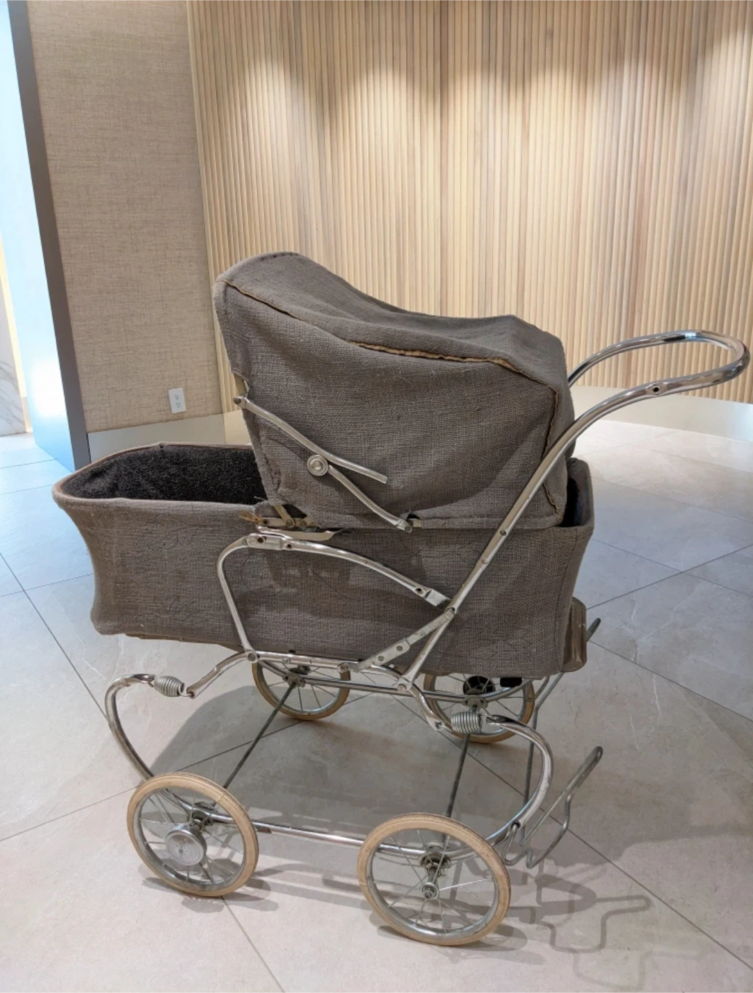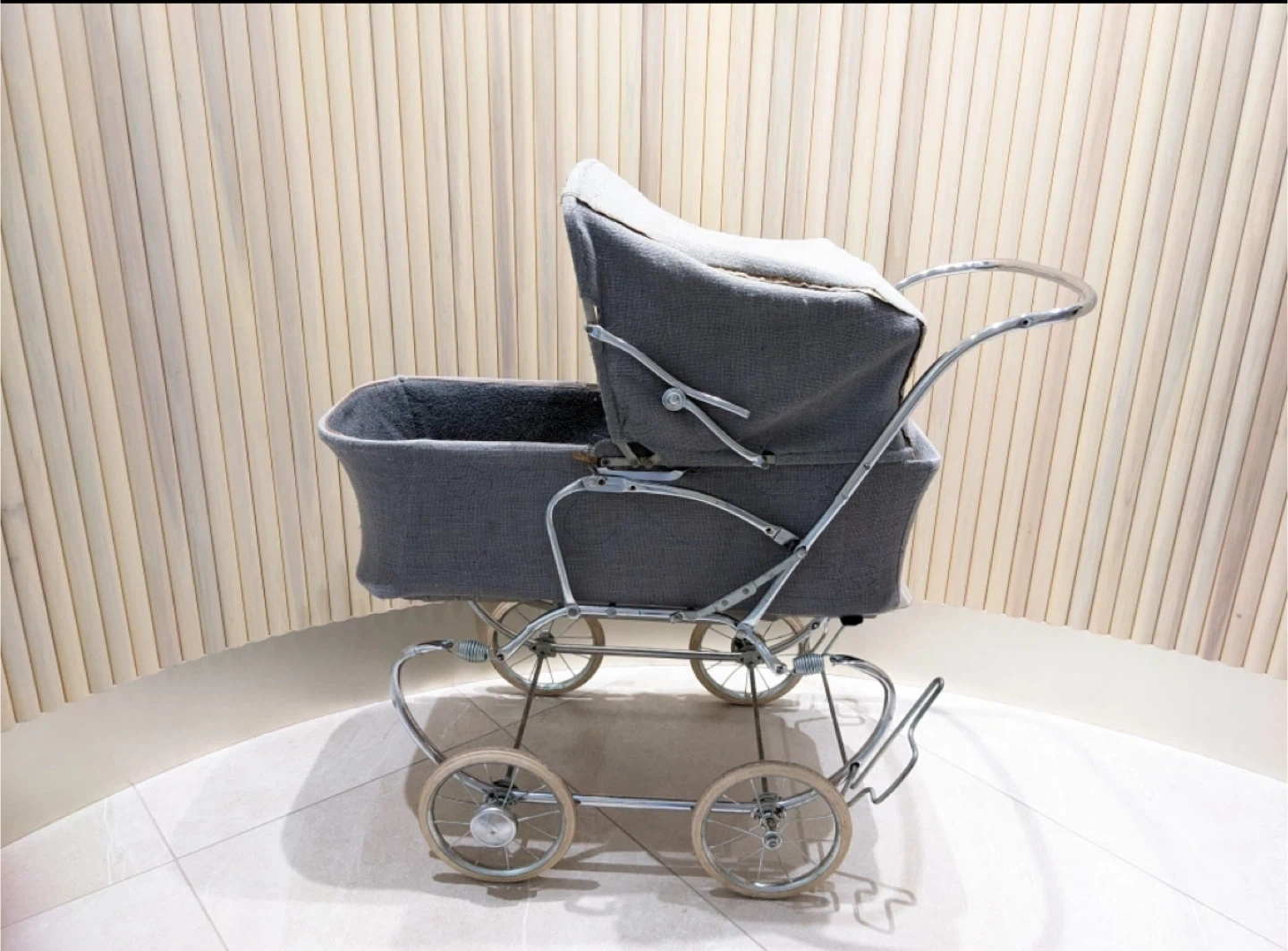 Selling a vintage-style baby pram in grey. It's in great condition and ready for a new home. Perfect for walks around the neighbourhood/ photoshoot/ cosplay!