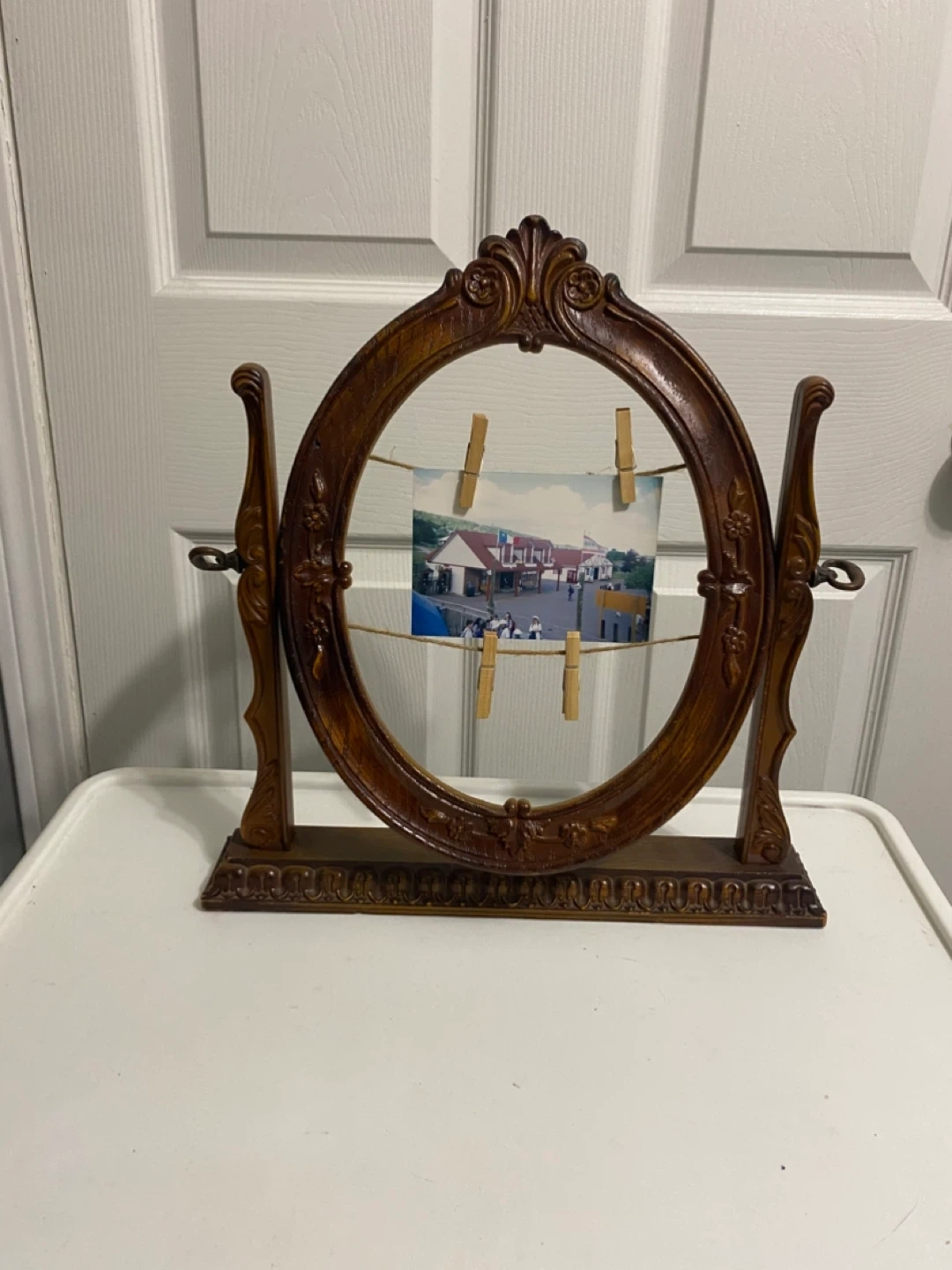 116Selling a charming vintage-style picture frame! It features a rotating oval frame with detailed carvings and a sturdy base. Perfect for displaying your favourite photos in a unique and elegant way