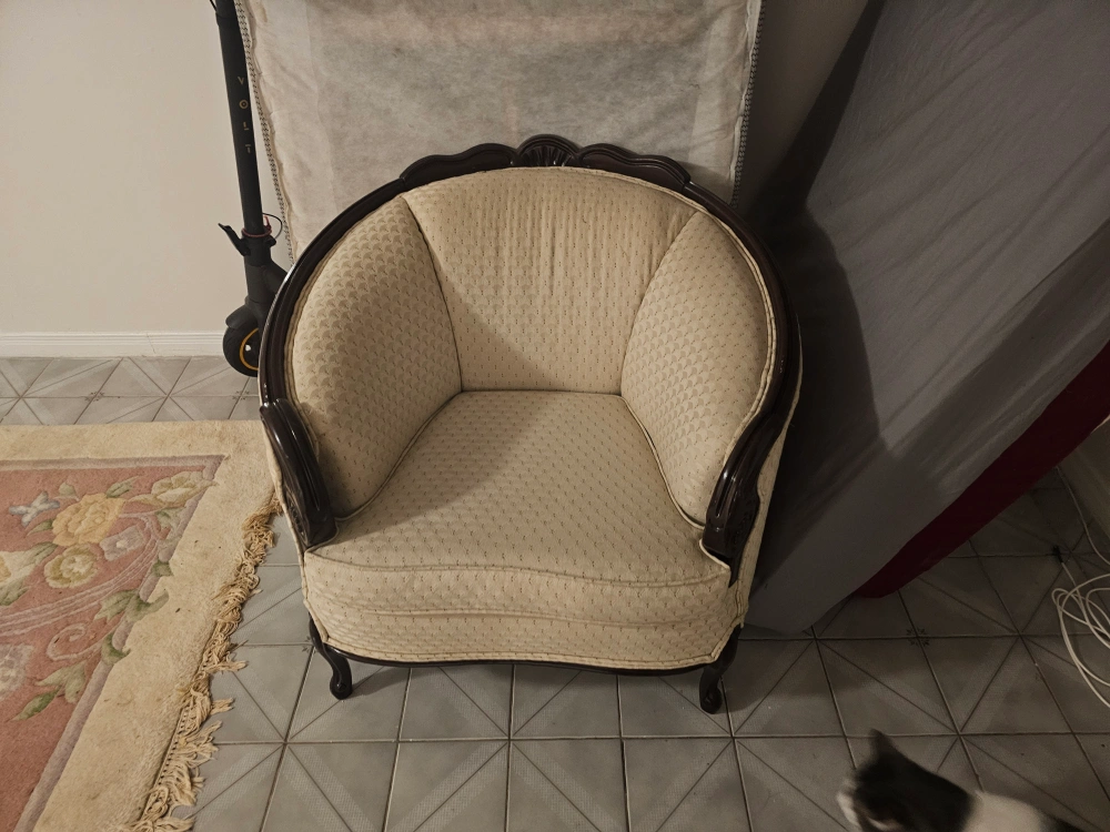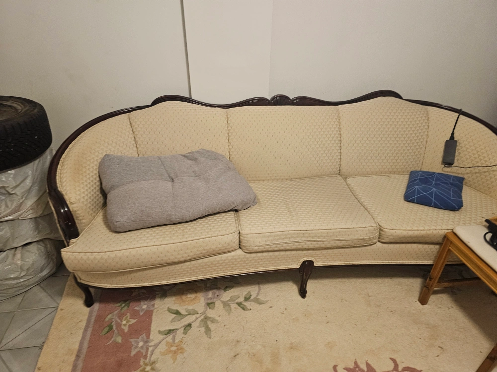 Selling a vintage-style sofa and armchair set. The sofa is a three-seater with a curved back and dark wood trim. The armchair has a matching design. Both pieces have a neutral-coloured fabric. Perfect for adding a touch of classic elegance to your home!