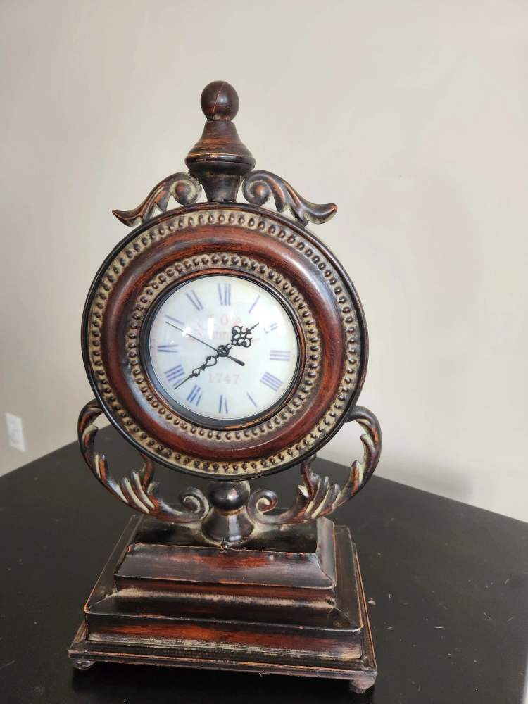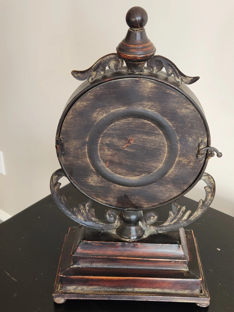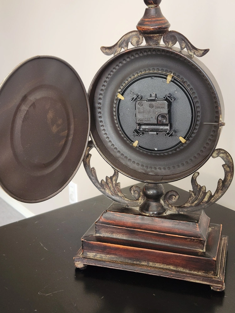 90Selling a charming vintage-style table clock! It has a lovely antique look with a round face and decorative details. The clock features a hinged back for easy access to the battery compartment. It would look great on a desk, shelf, or mantel!