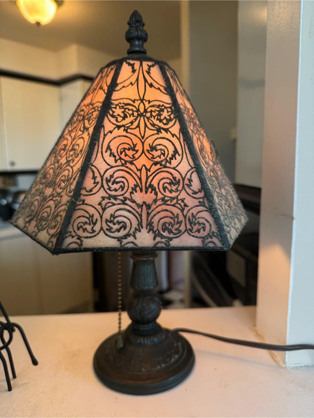 67Selling a vintage-style table lamp. It has a unique patterned shade and a decorative base. It would be a great addition to any room!
