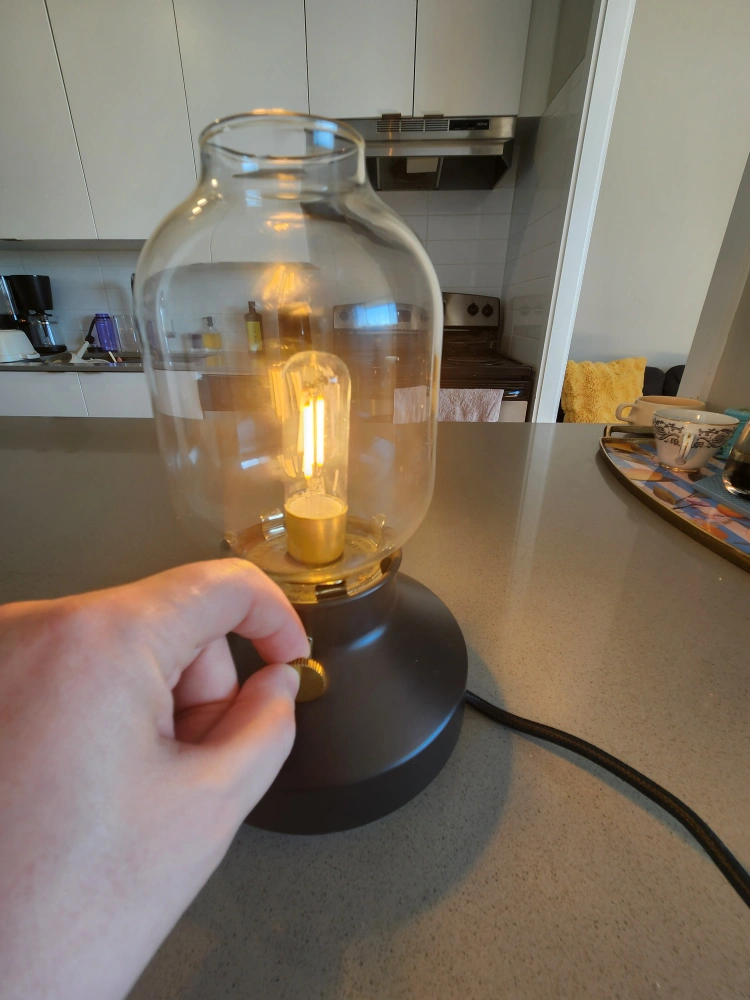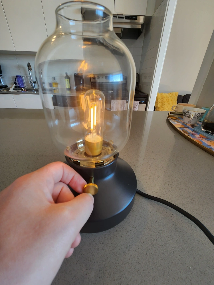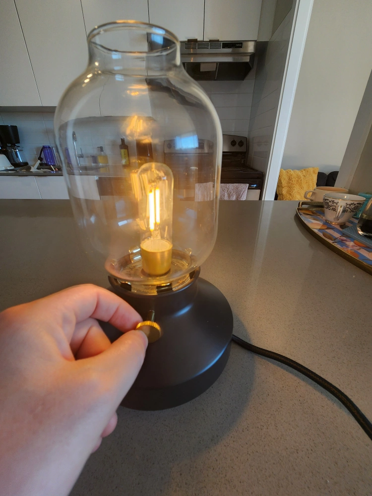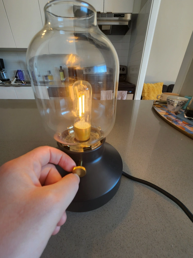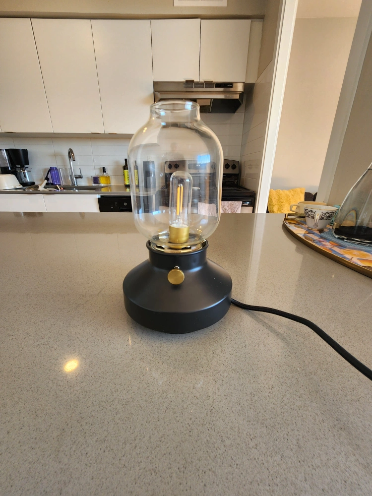 Selling a vintage-style Edison lamp! It features a sleek black base and a clear glass shade, perfect for adding a warm glow to any room. It's in great condition and ready to brighten up your space. My favorite feature about this lamp is the dimness/lightness is adjustable to suit on your mood! It's really handy for late night reading sessions, or for a bedside night-light glow. let me know if you're interested! πβ¨