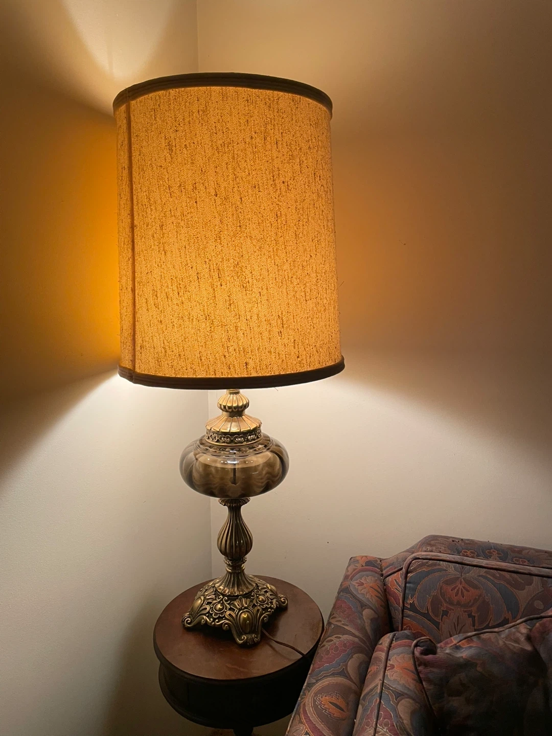 10Selling a lovely vintage-style table lamp. It has a unique base and a warm-toned shade that creates a cozy atmosphere. Perfect for adding a touch of retro charm to any room!
