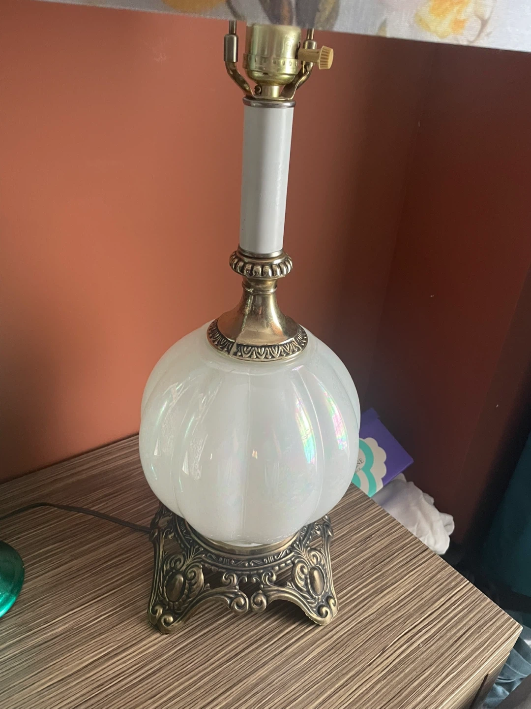 26Here's a lovely vintage-style table lamp with a pearlescent white glass body and ornate gold-tone base and top. It adds a touch of elegance to any room!