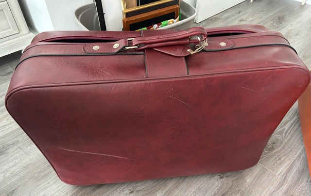 This vintage burgundy suitcase is ready for its next adventure! While it has journeyed through time, showing some scuffs and character marks, it's still sturdy and functional. It's perfect for adding a touch of retro flair to your travels or as a unique decorative piece.