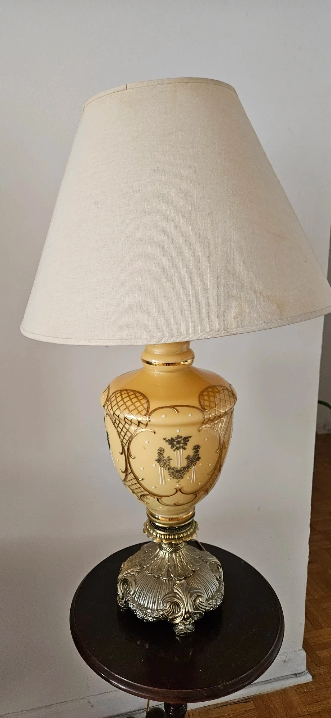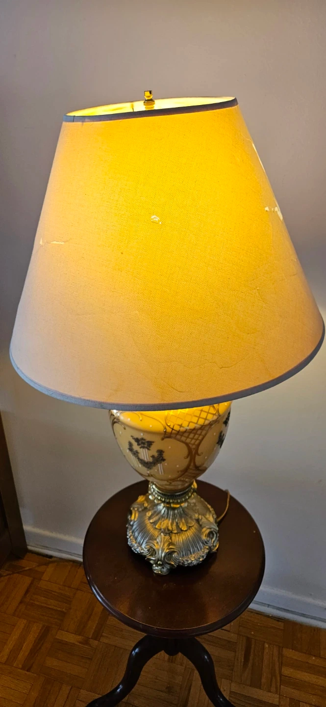 70Selling a vintage table lamp with a cream-colored shade and gold accents. The base has an ornate design. The shade has some wear and tear, but the lamp still works great and would look lovely in any room