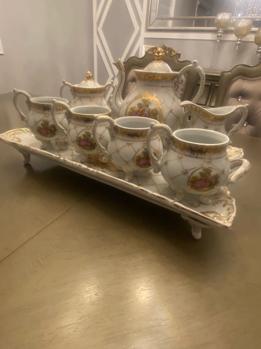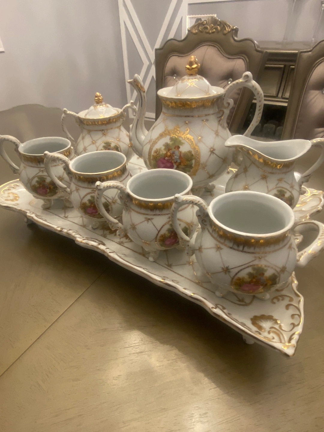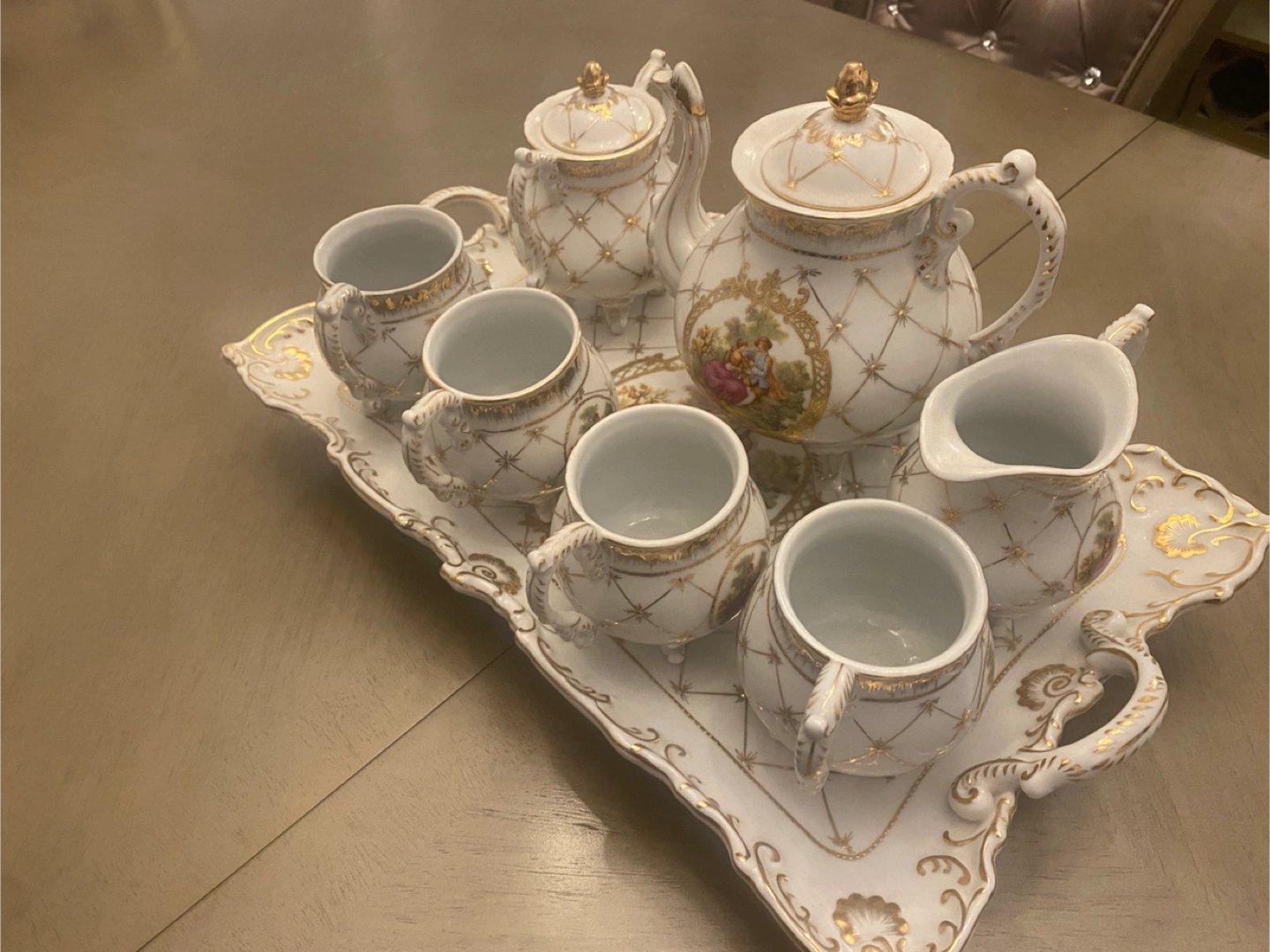 12Beautiful vintage tea set with a delicate white and gold design. Includes a teapot, creamer, sugar bowl, and 4 cups, all displayed on a matching tray. Perfect for adding a touch of elegance to your tea time!🙏