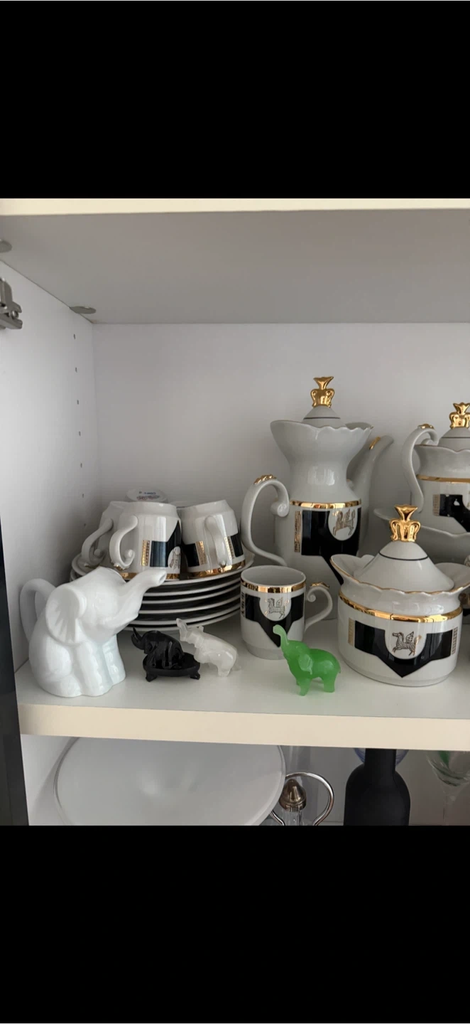 Selling a vintage tea set . The tea set features a white and black design with gold accents.