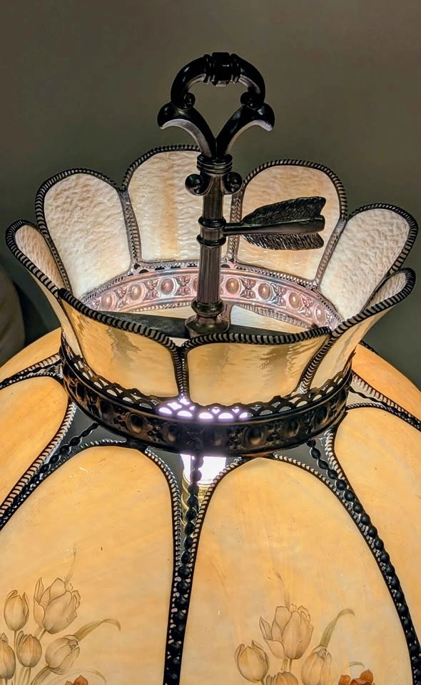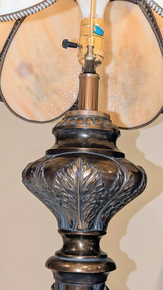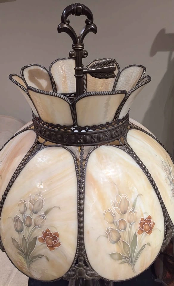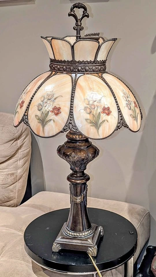181A beautiful vintage statement lamp with incredible presence — 36” tall with a gorgeous crown-petal shade and classic Victorian styling. Features: Heavy, high-quality cast base with ornate antique-bronze detailing Tiffany-style floral design petal shade made from marbled cream slag-glass panels Crown-top design with intricate decorative trim Lights up beautifully and creates a warm, elegant glow Excellent overall condition, no cracks or chips to the shade, no structural issues (Bulb not included) This piece brings vintage charm, rich detail, and a warm ambient light, perfect for a living room, reading corner, or vintage-inspired décor! Asking 180 OBO for fastest pickup... Burlington 📍