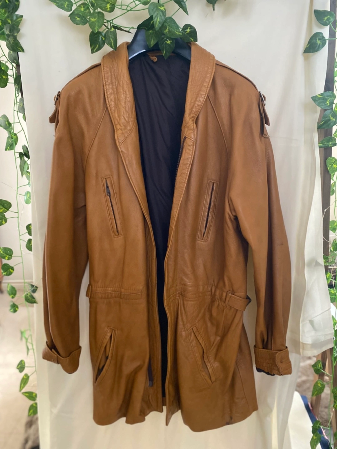 309This unique vintage toffee leather jacket features a cinched waist, dropped shoulder construction, pockets, and shoulder strap detailing. Genuine leather. Size 40. Gender neutral Some minor wear and tear (check photos) but in good vintage condition. ***open to offers***