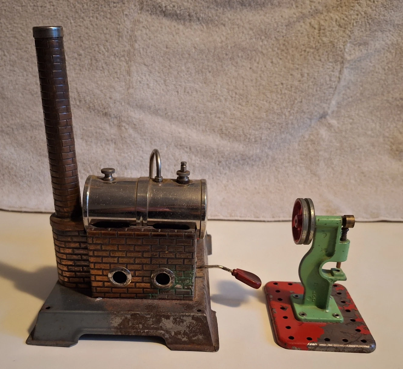 12Selling a vintage toy steam engine and punch press. Both items show signs of wear and age, adding to their unique character and charm. Perfect for collectors or enthusiasts of vintage toys and mechanical artifacts. Steam boiler/engine is made in Germany and the punch is MAMOD England.