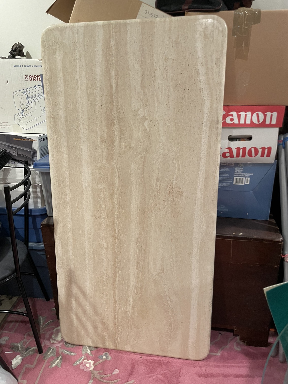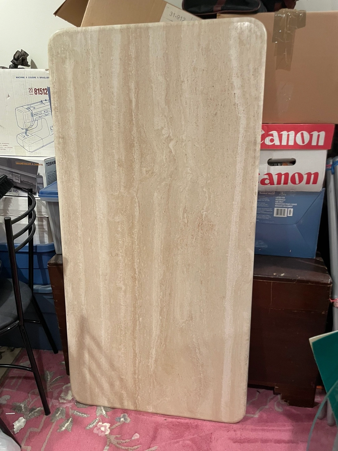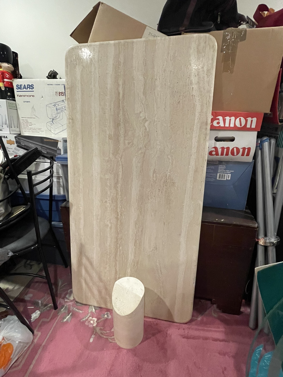 38Beautiful large vintage travertine coffee table, it is in very good condition and is roughly 27"wx54”Lx12”h. Stone is about 1” thick. Beautiful natural stone - no chips or cracks with four solid travertine cyndrylical bases. I included a rendering as it’s too heavy to display on my own at the moment. Pickup only at John and Leslie in Thornhill