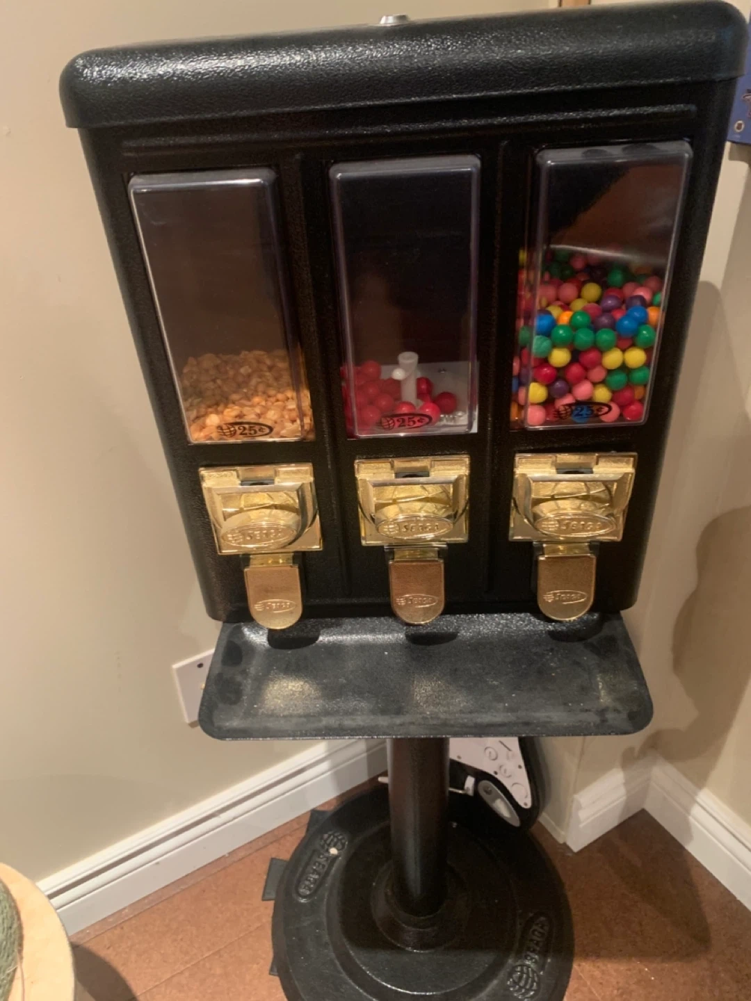 10Selling a vintage triple gumball machine! It has three compartments for different candies or gumballs. Perfect for a games room or adding a retro touch to your home