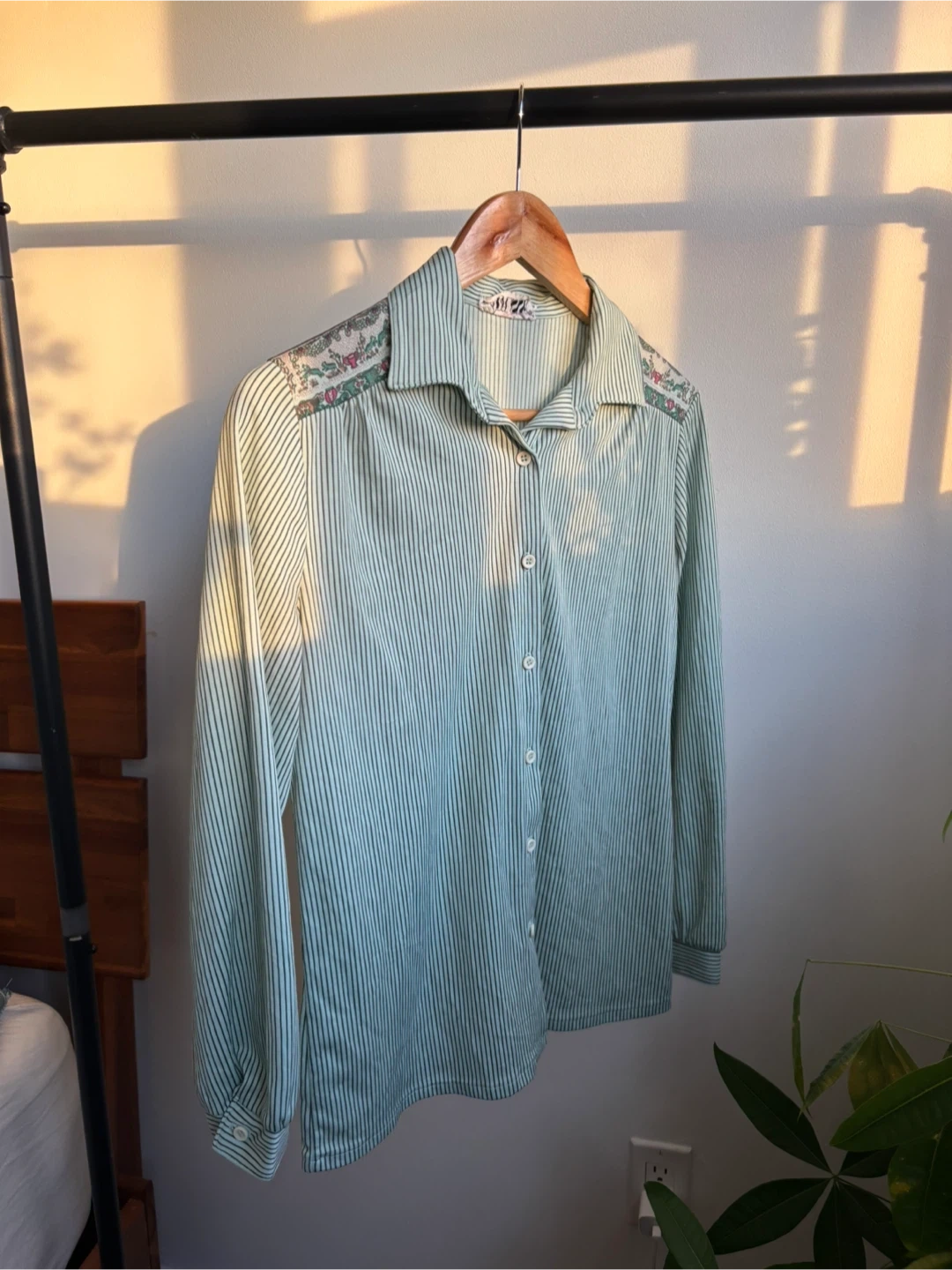 Vintage blouse from Trissi! It features a unique floral design on the shoulders. Perfect for adding a vintage touch to your wardrobe!