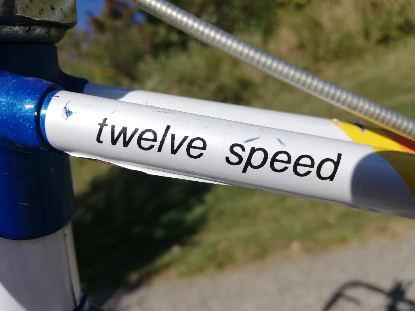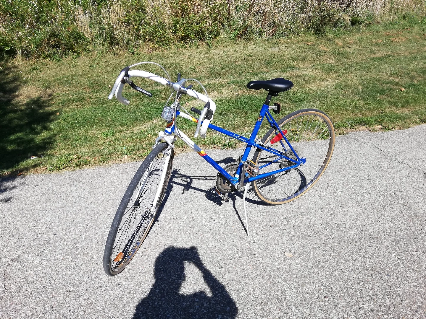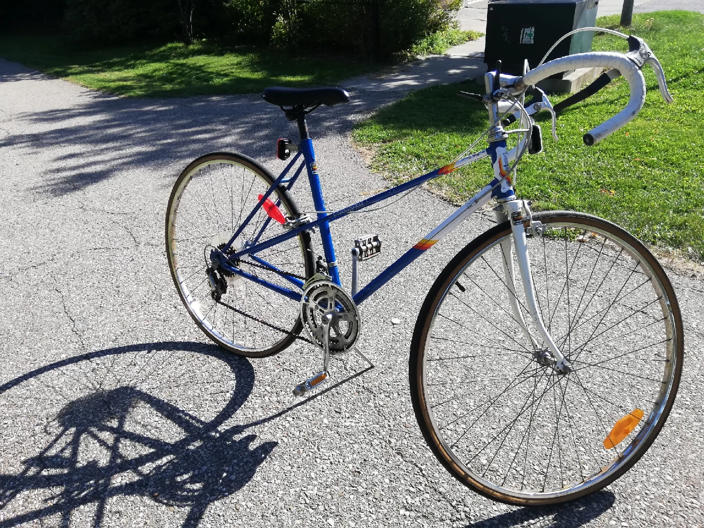 Selling a vintage bicycle with twelve speeds! It has a blue and white frame with some wear and tear, but it's still a great ride