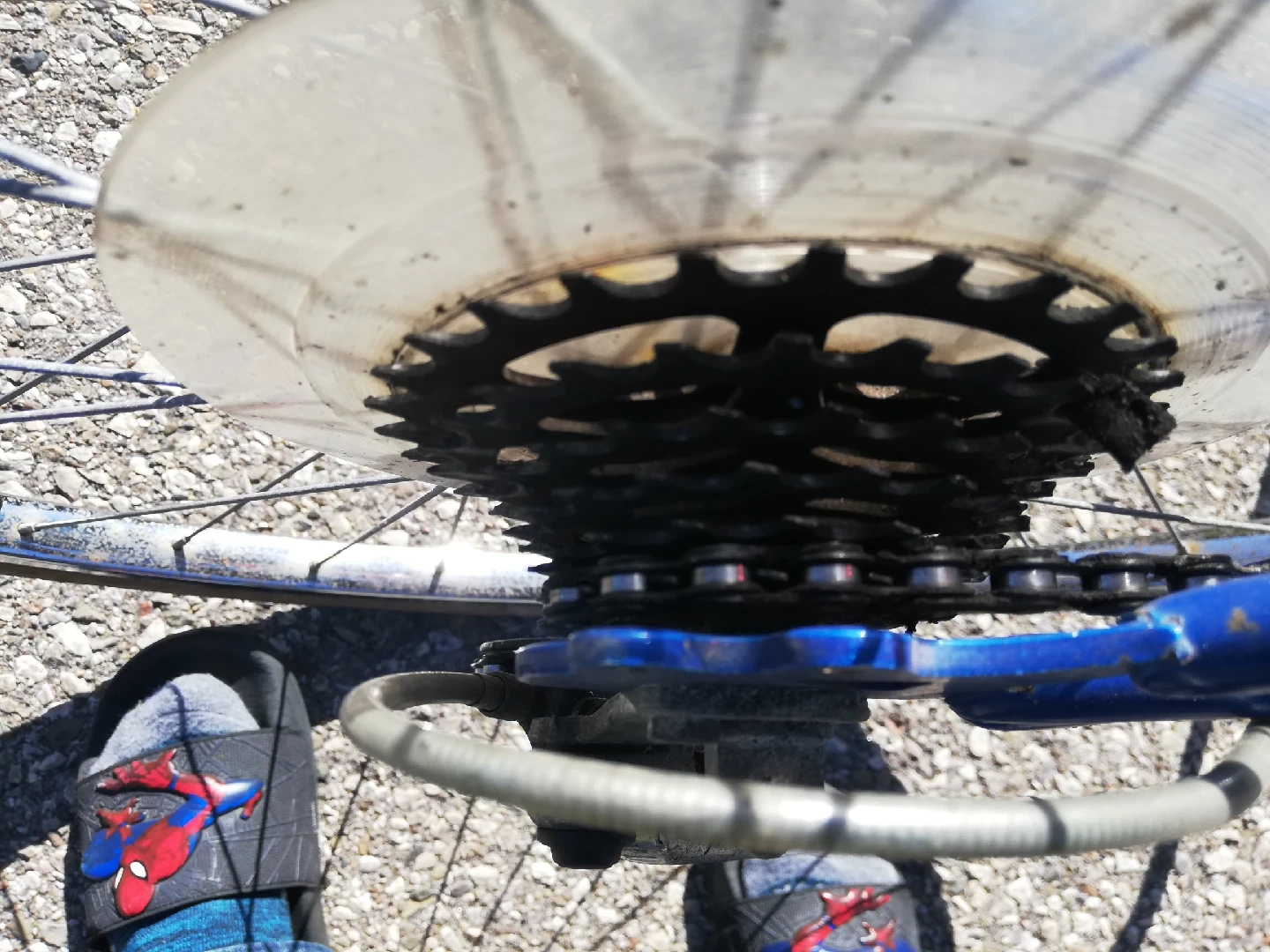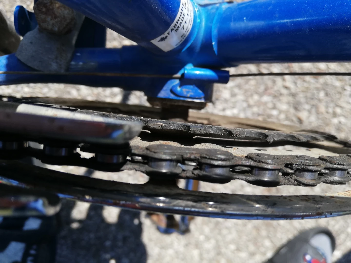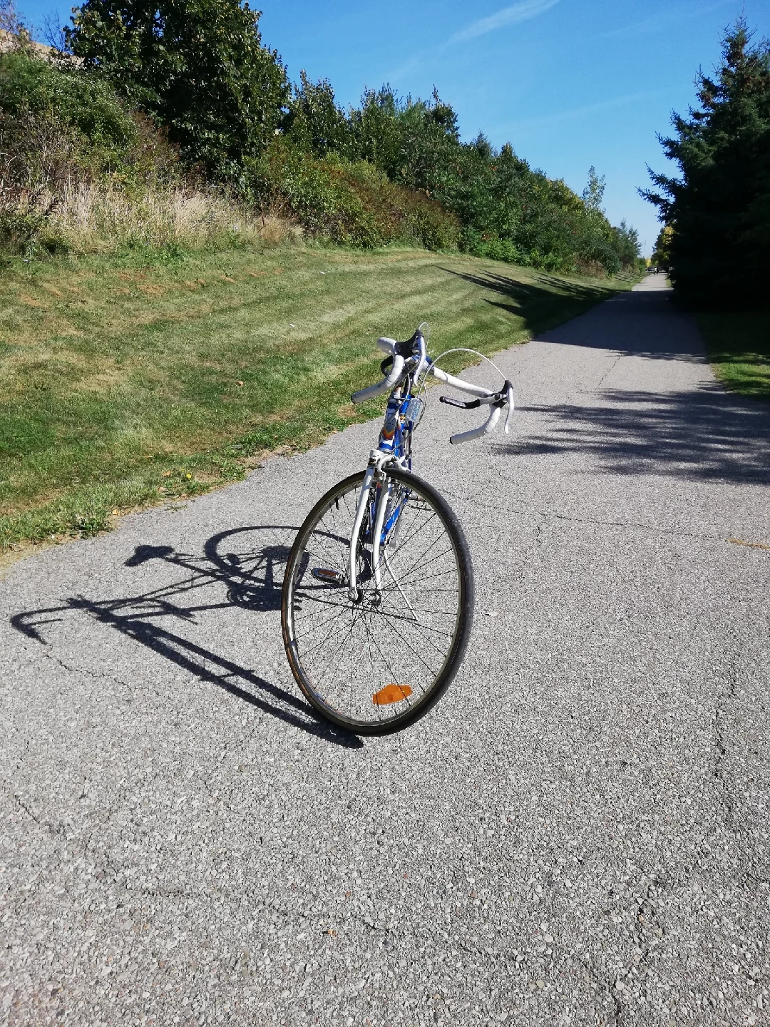Selling a vintage bicycle with twelve speeds! It has a blue and white frame with some wear and tear, but it's still a great ride