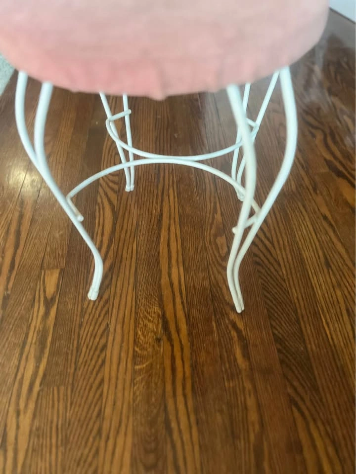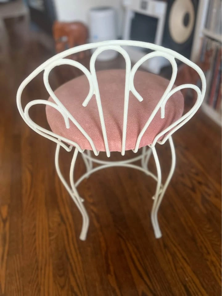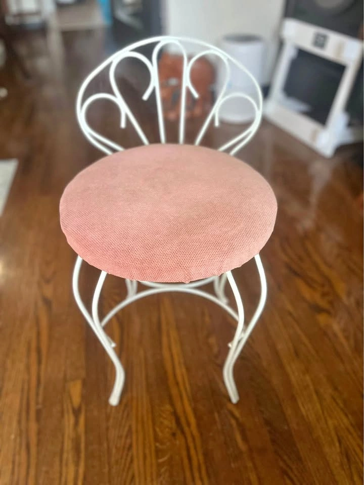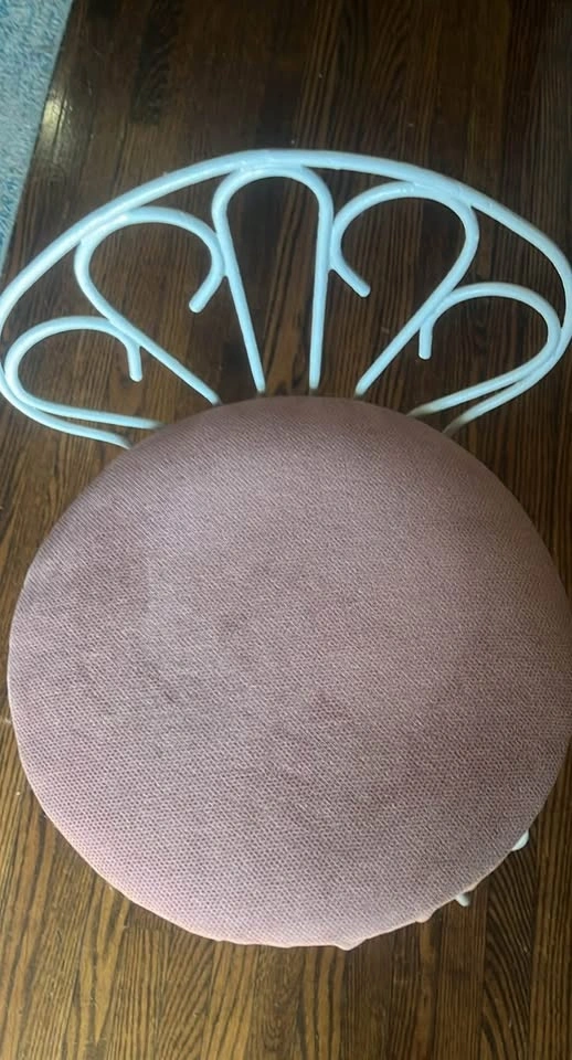 Vintage Vanity Chair - (can be used for childs (6+) desk/bedroom chair) White frame, pink fabric. Total Height: 24.5” Height to Seat: 17.5” Width of Seat: 14” (taken at widest width) Good, clean condition. No rips in fabric, sturdy, balanced legs. Functional as is or great refurb piece. Pick up ONLY: Etobicoke (Martingrove/Silverstone) Cash ONLY