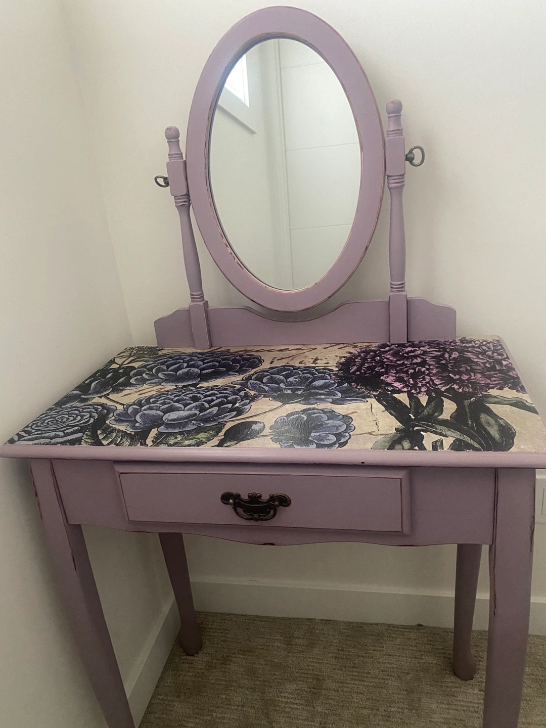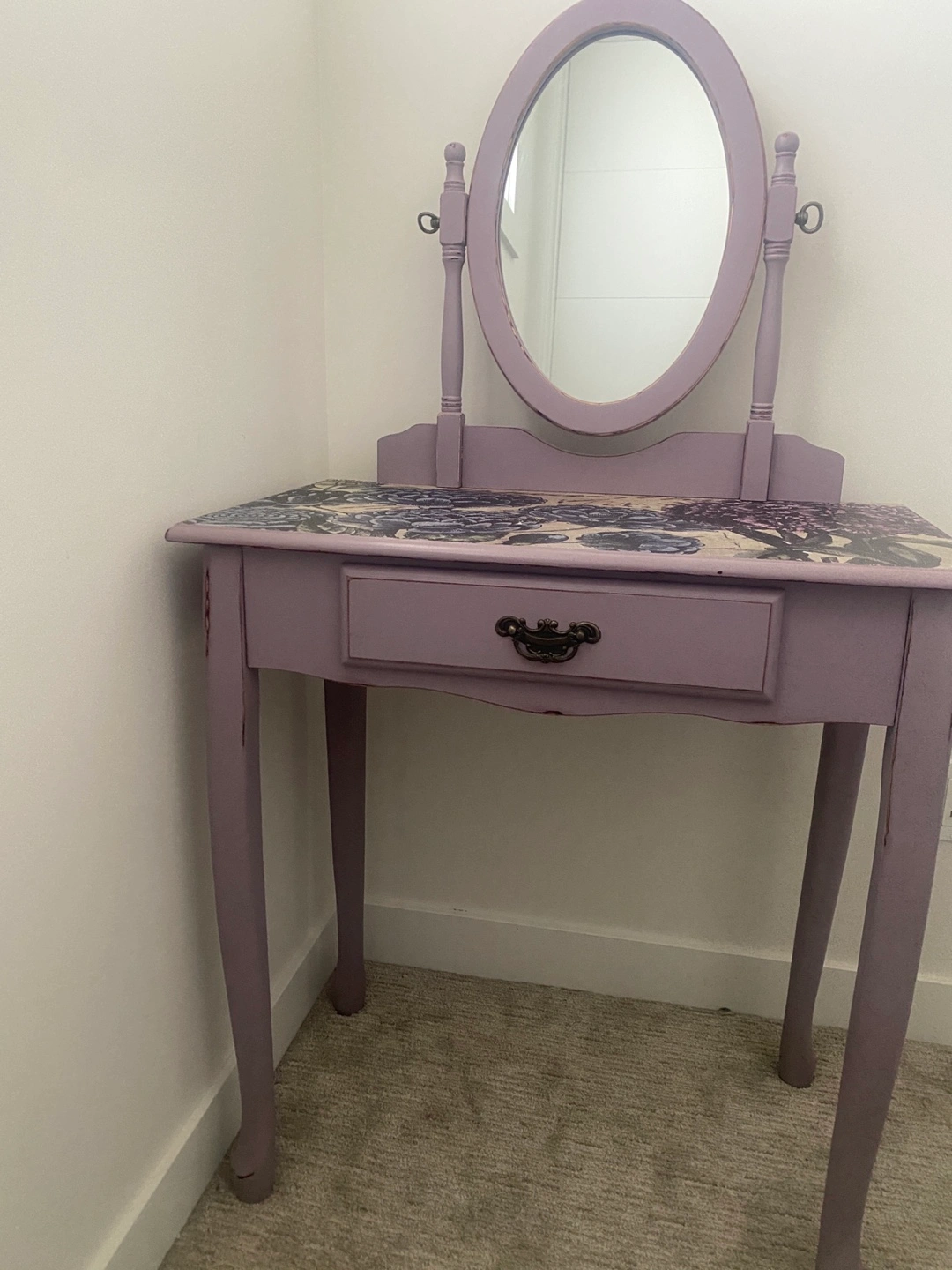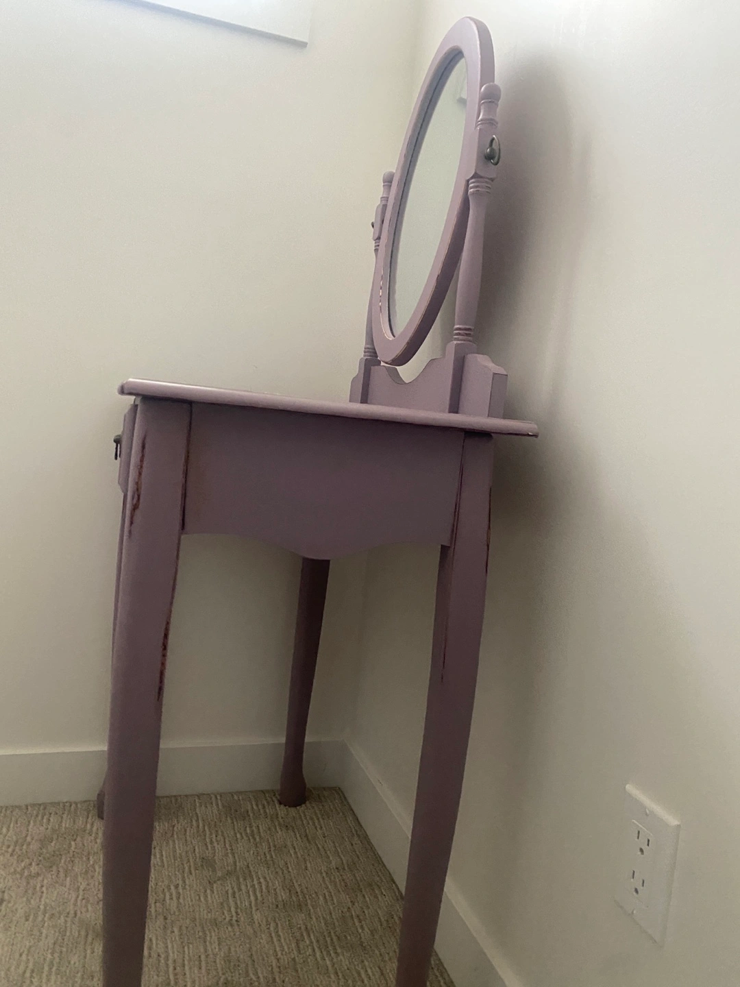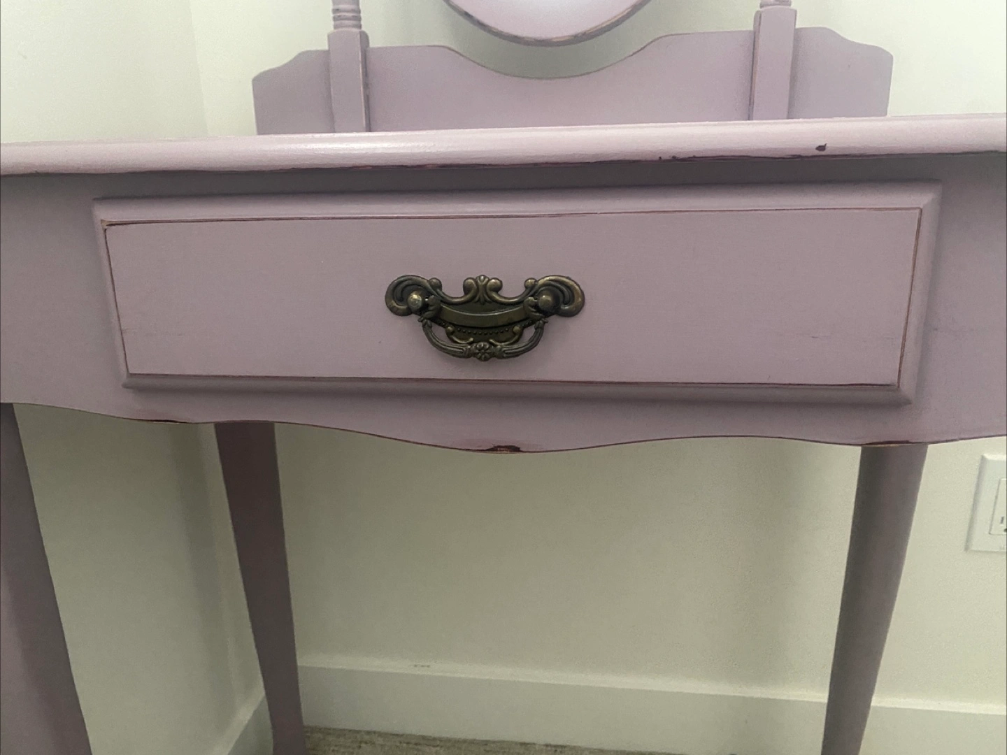 Lovely vintage vanity set. Features a lavender-painted vanity table with a single drawer and a tri-fold mirror. Includes a coordinating vanity stool with a metal frame and floral upholstery. Some wear and tear present. I had bought three to four years ago. The vanity its self is in very good condition except for a few scratches on the table. The chair that comes with it is optional to buy because it has rips on it. I am selling the chair around $20 to $30.It totally up to you if you would like to purchase it. I would be happy to lower the price for you of you would like for the vanity just please ask nicely 🥰
