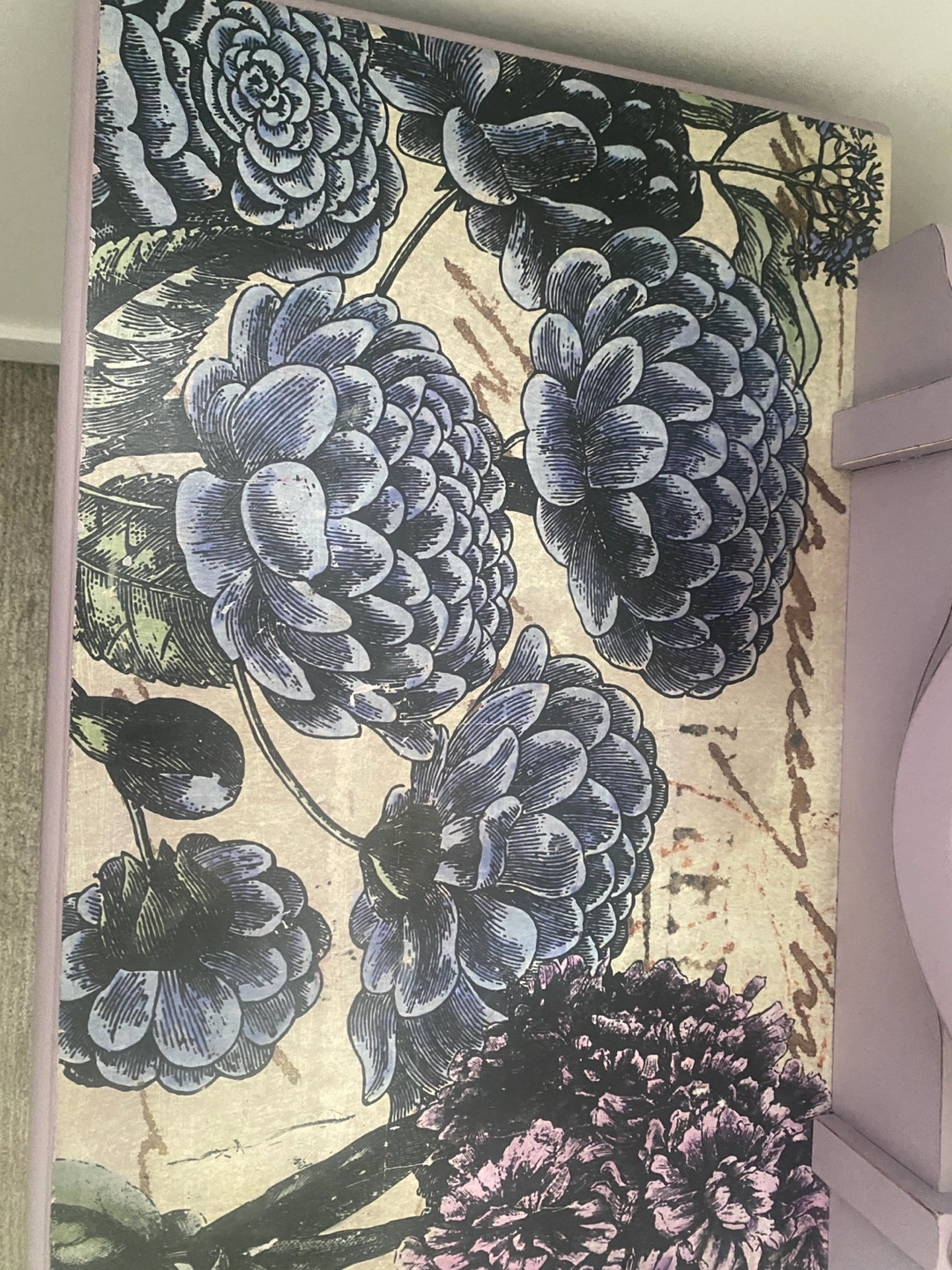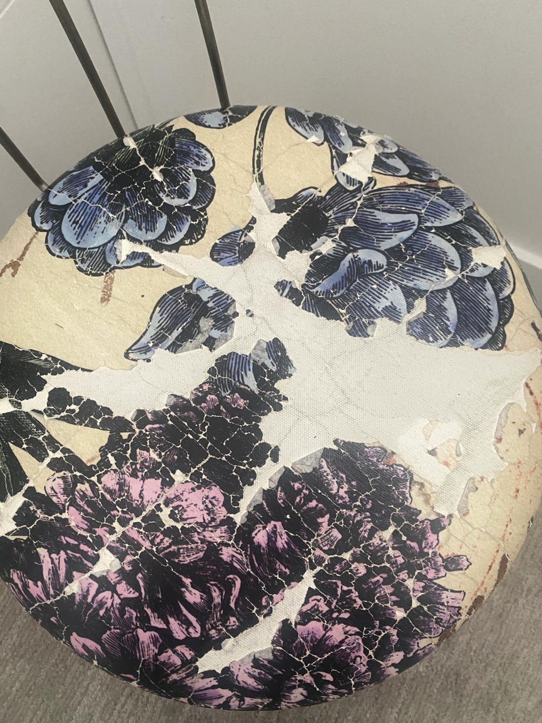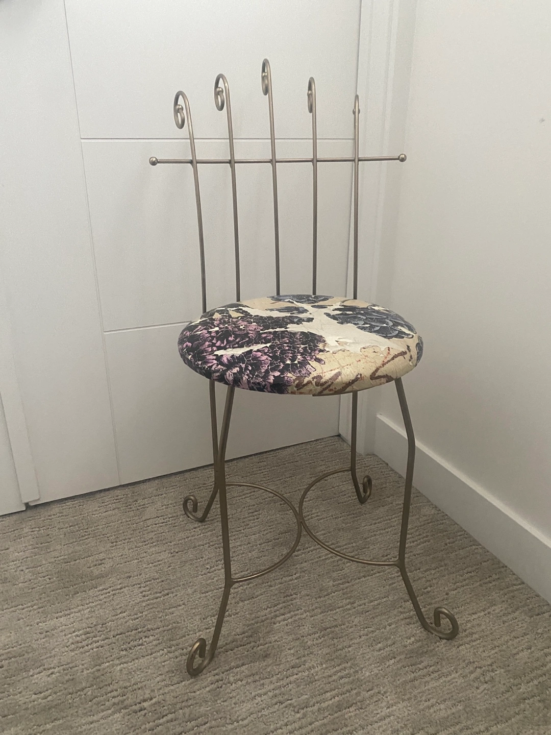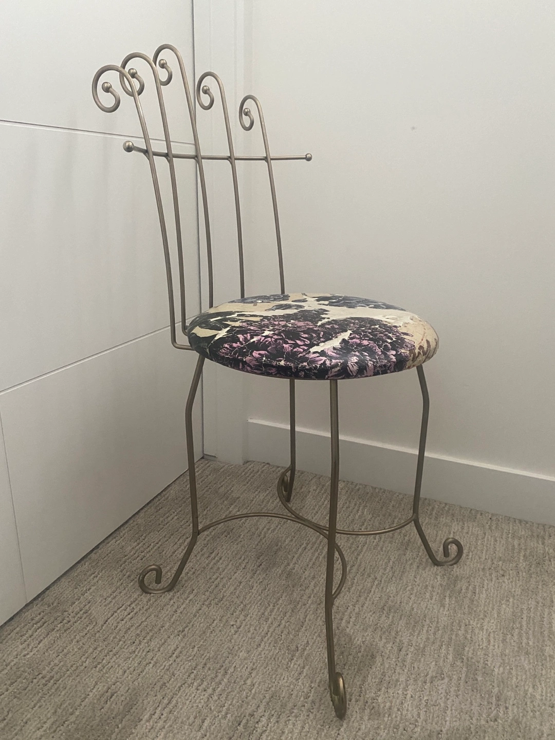 Lovely vintage vanity set. Features a lavender-painted vanity table with a single drawer and a tri-fold mirror. Includes a coordinating vanity stool with a metal frame and floral upholstery. Some wear and tear present. I had bought three to four years ago. The vanity its self is in very good condition except for a few scratches on the table. The chair that comes with it is optional to buy because it has rips on it. I am selling the chair around $20 to $30.It totally up to you if you would like to purchase it. I would be happy to lower the price for you of you would like for the vanity just please ask nicely 🥰